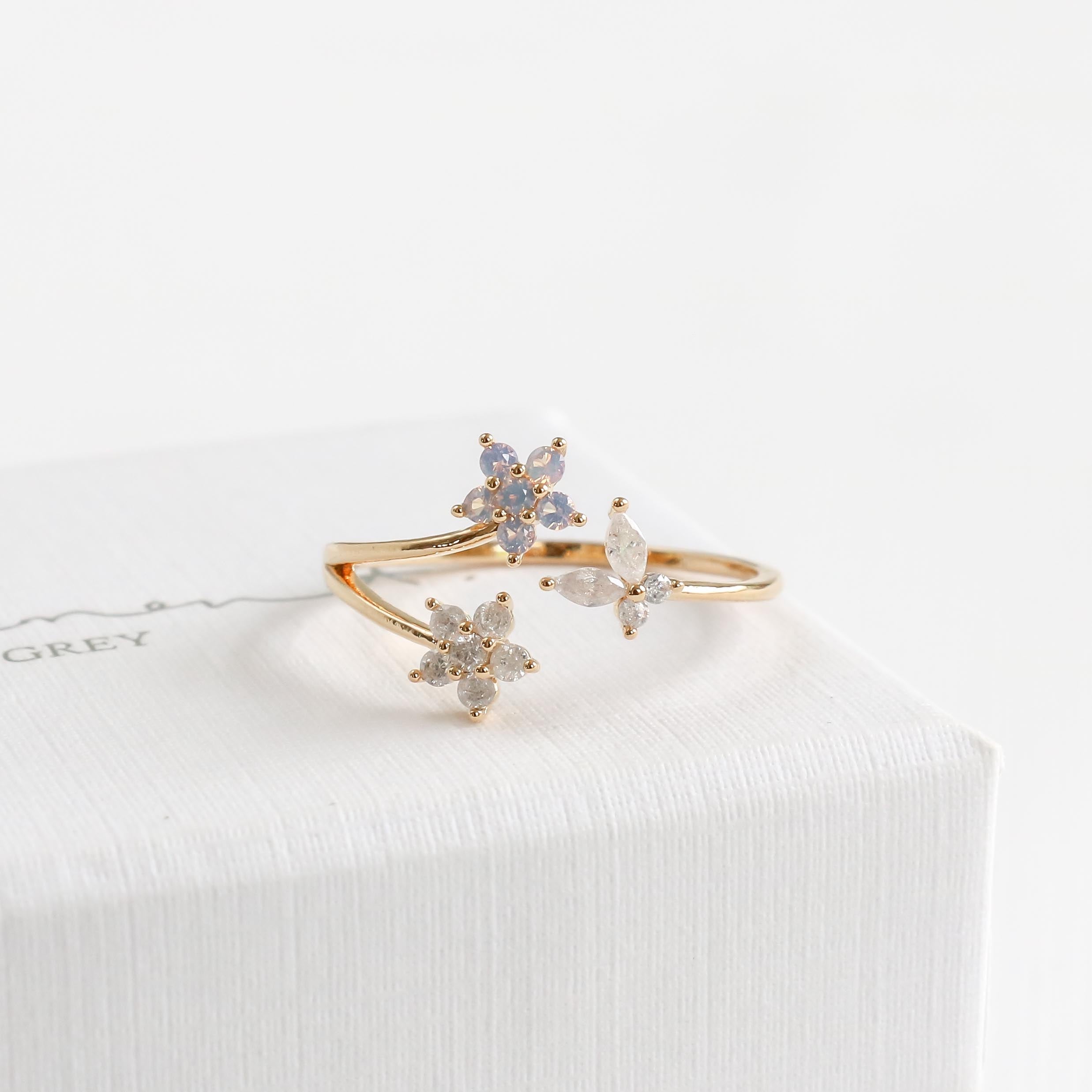 Introducing our Double Blossom Butterfly Ring - two beautifully crafted blossoms featuring lilac pink stones and high quality lustrous CZ stones. Embrace the butterfly charm with comfort as it wraps around your finger - the perfect addition to any look!