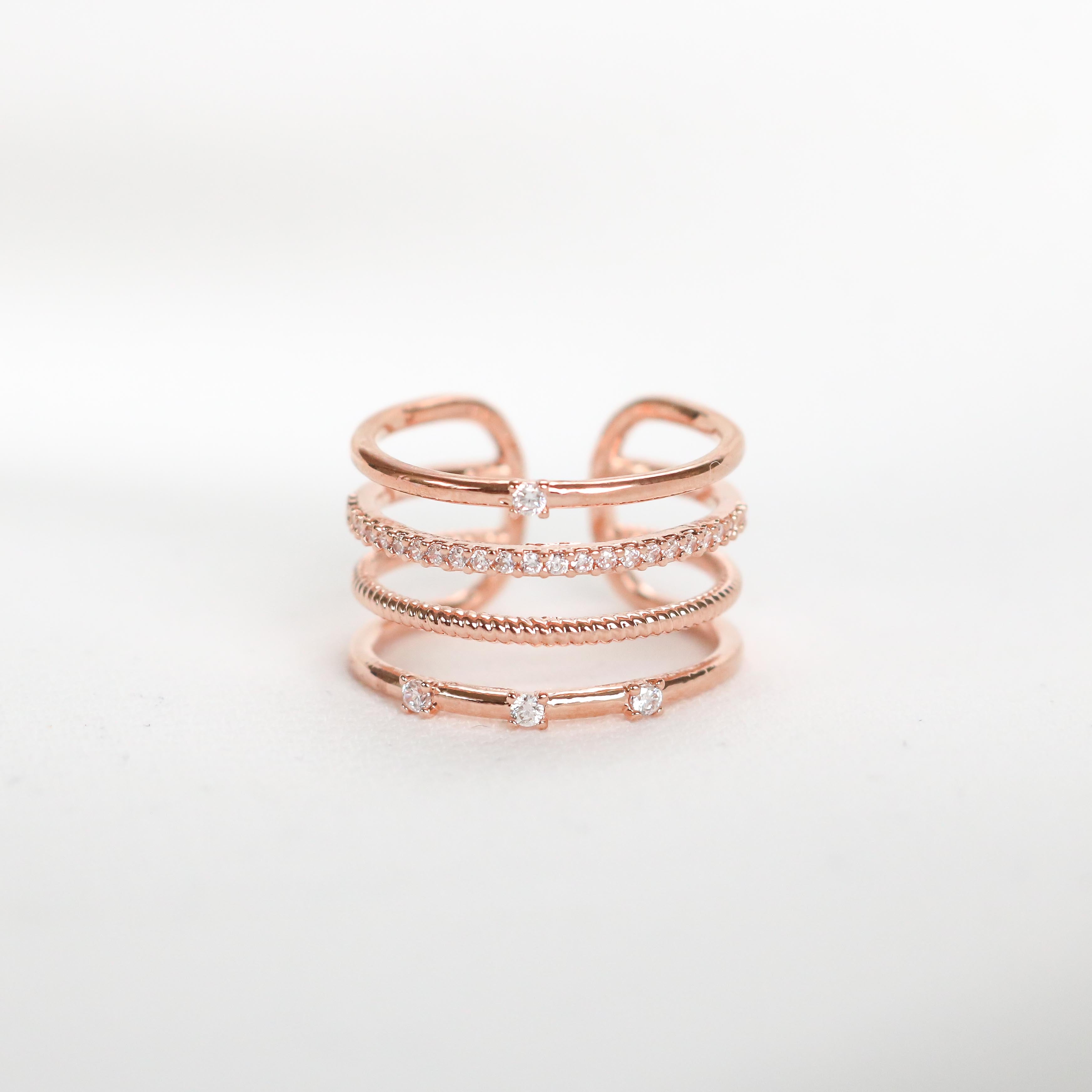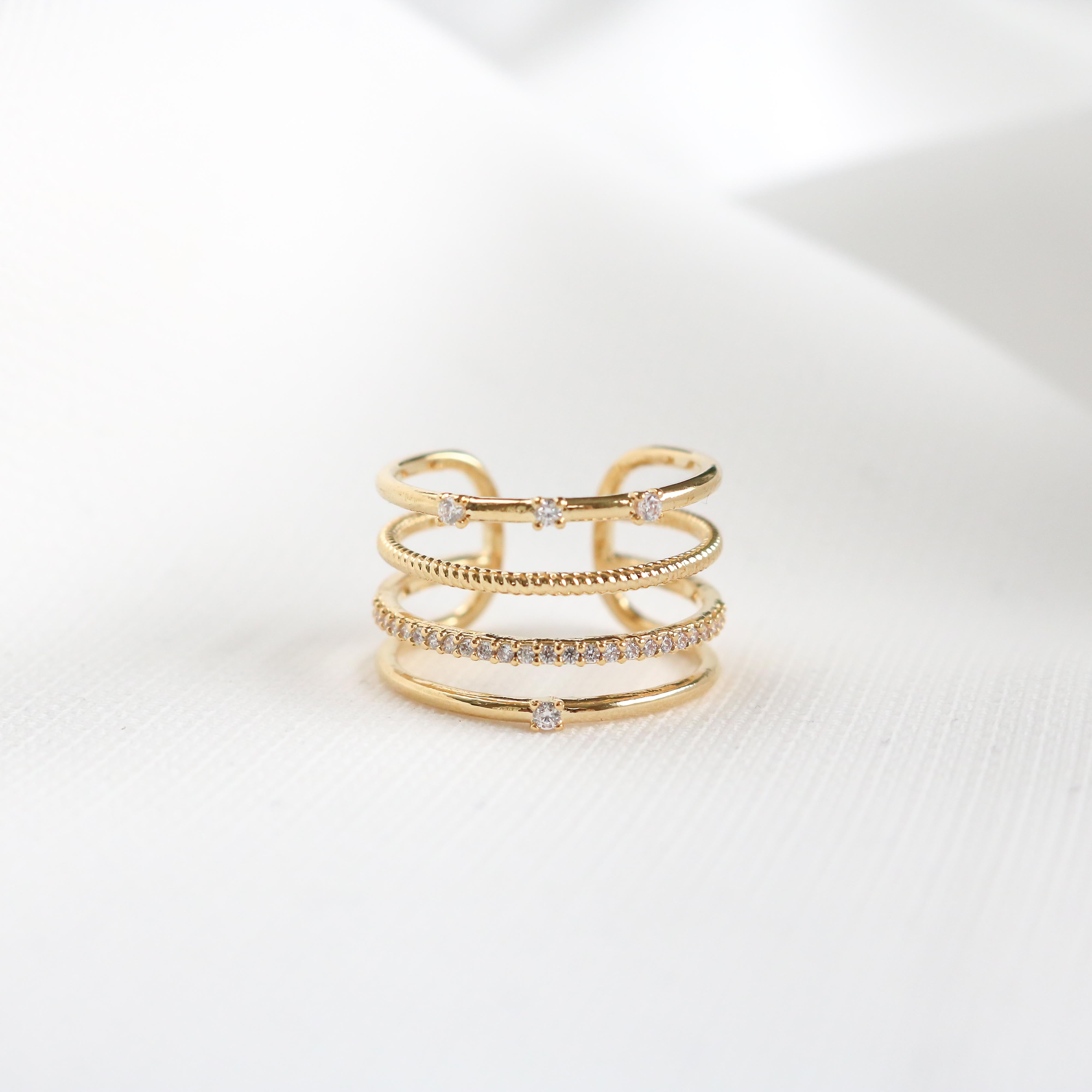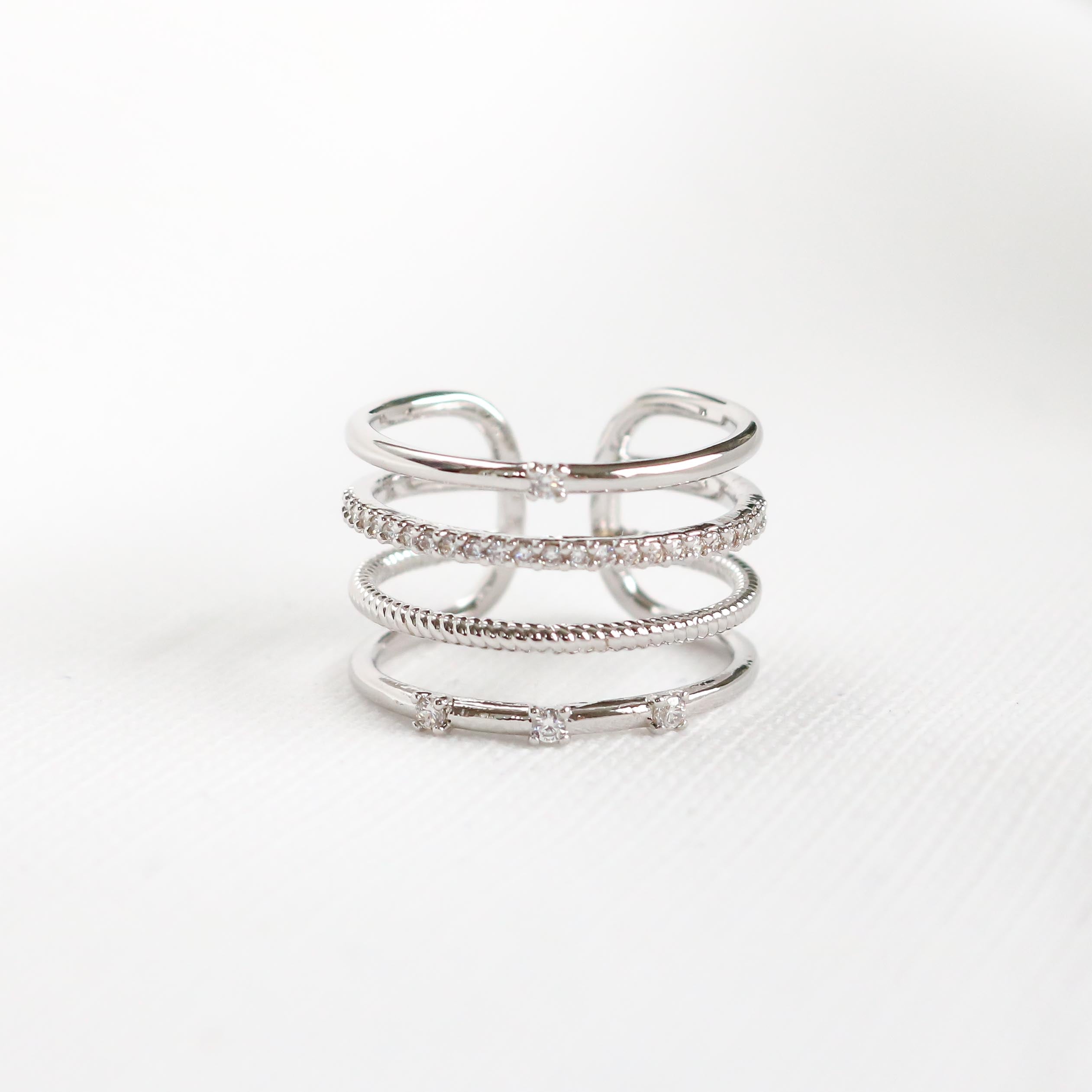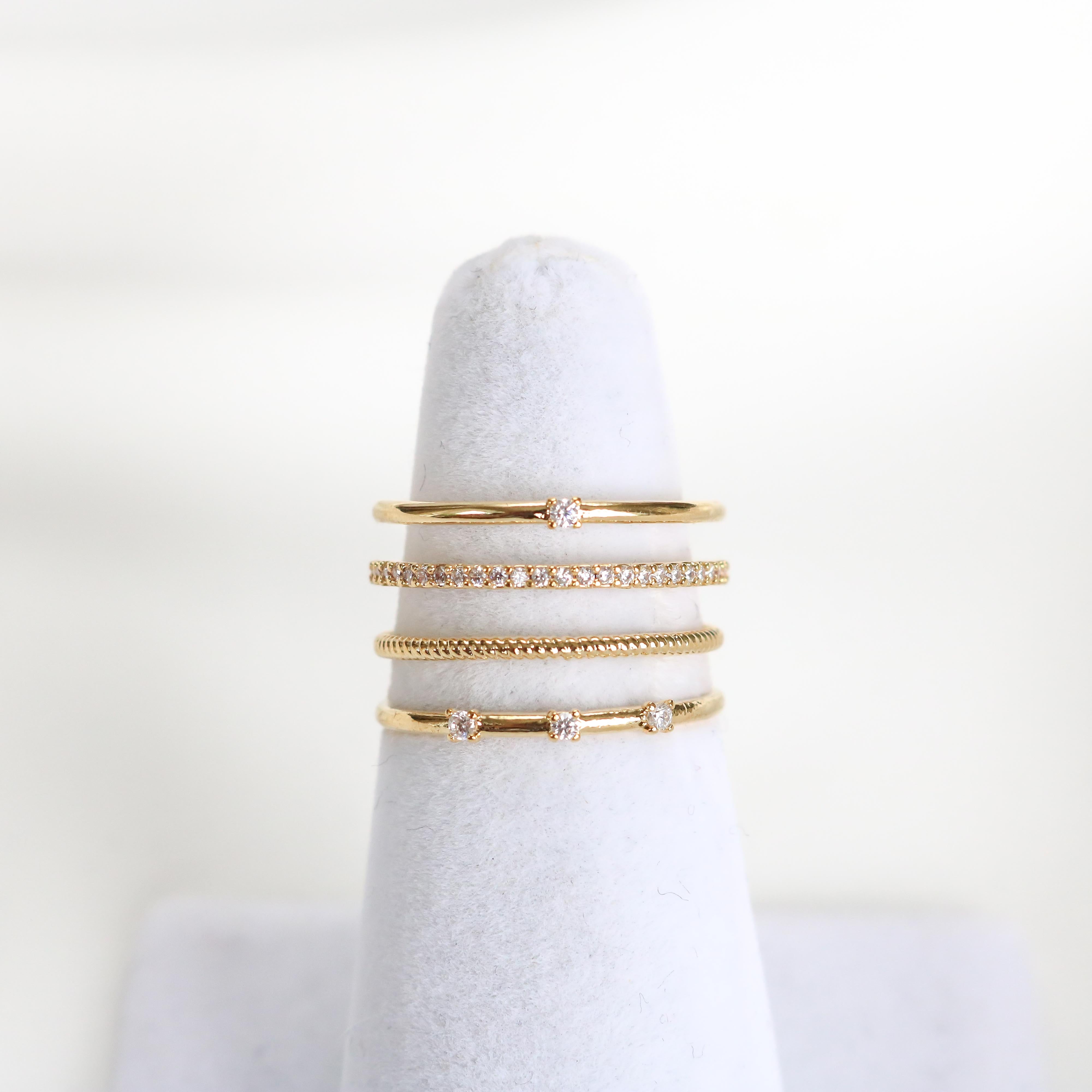 The Palm Line ring is the ultimate stacking ring, featuring four unique bands, with a line of single crystal, a beaded twist and a crystal-encrusted band.