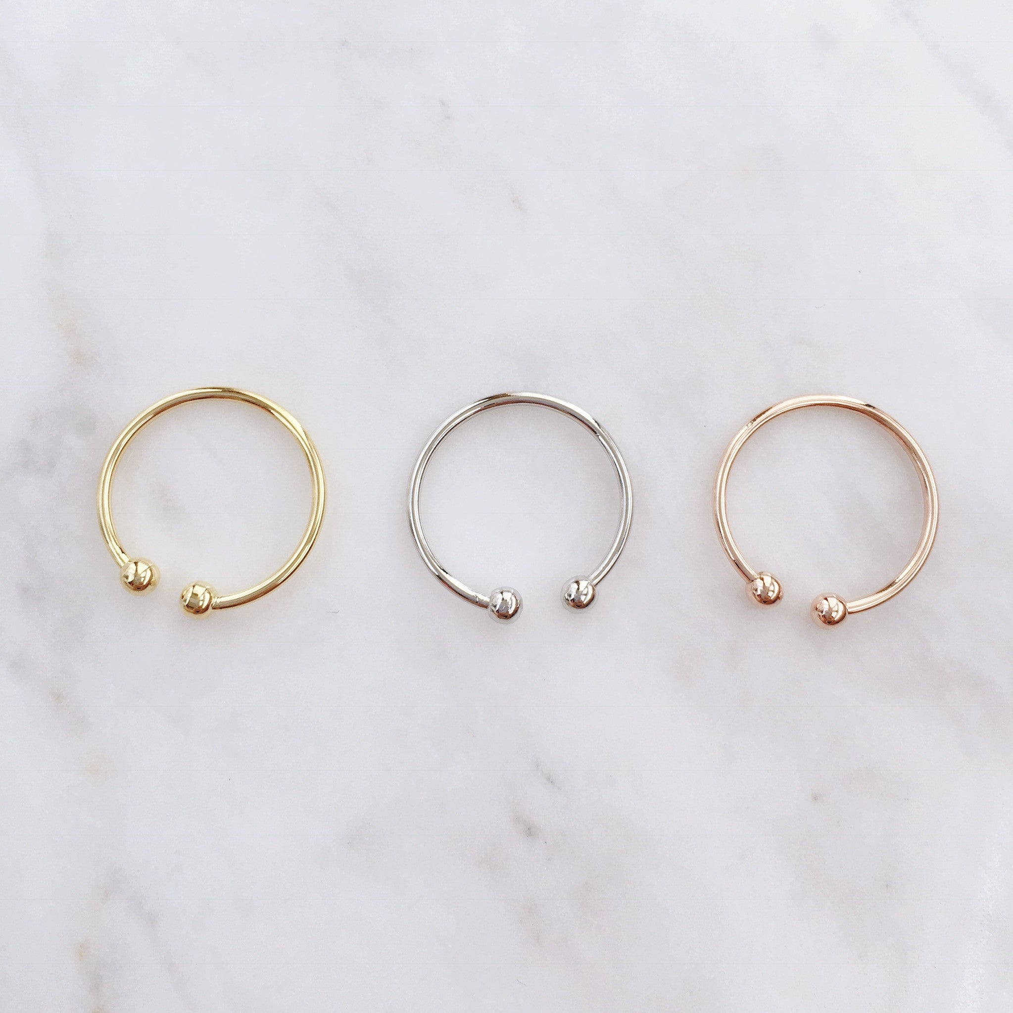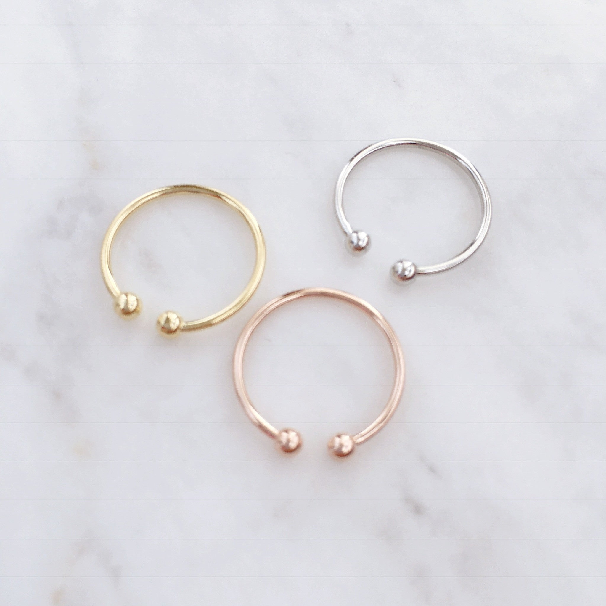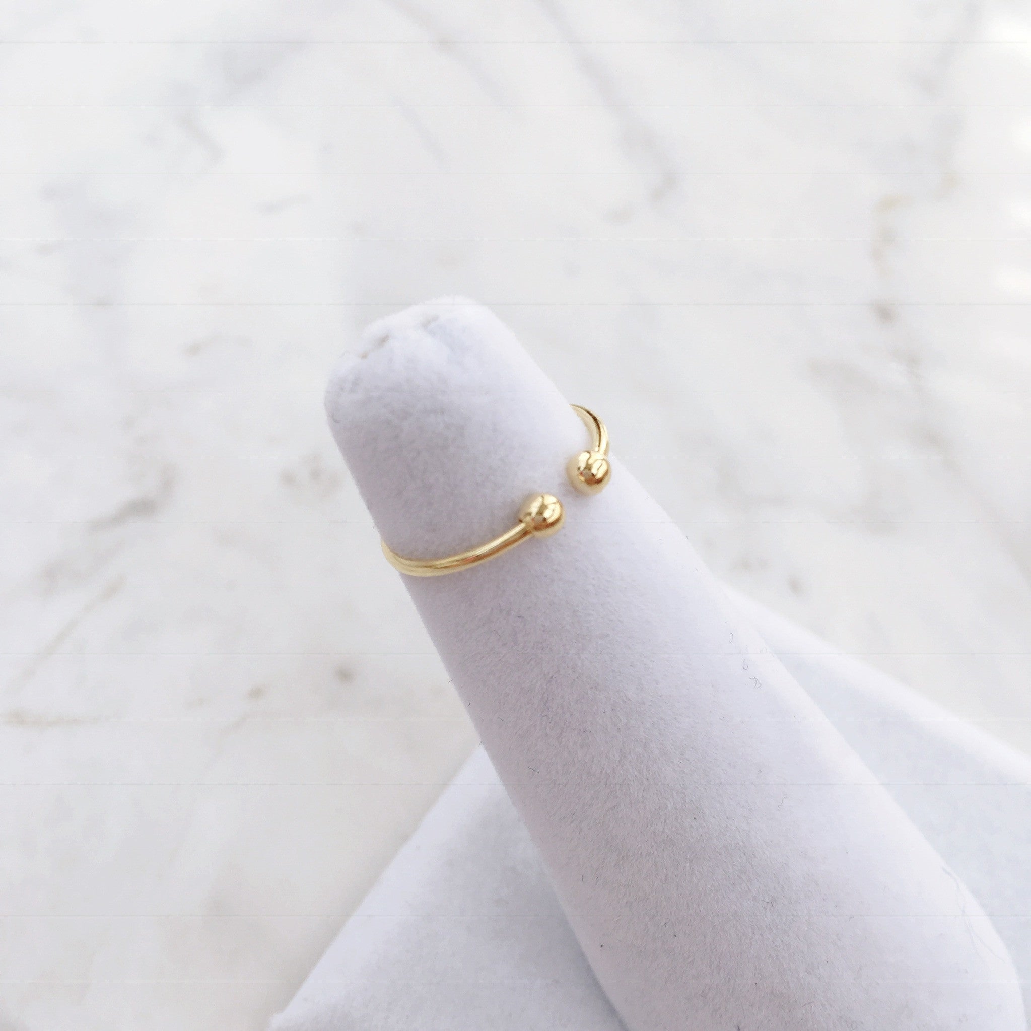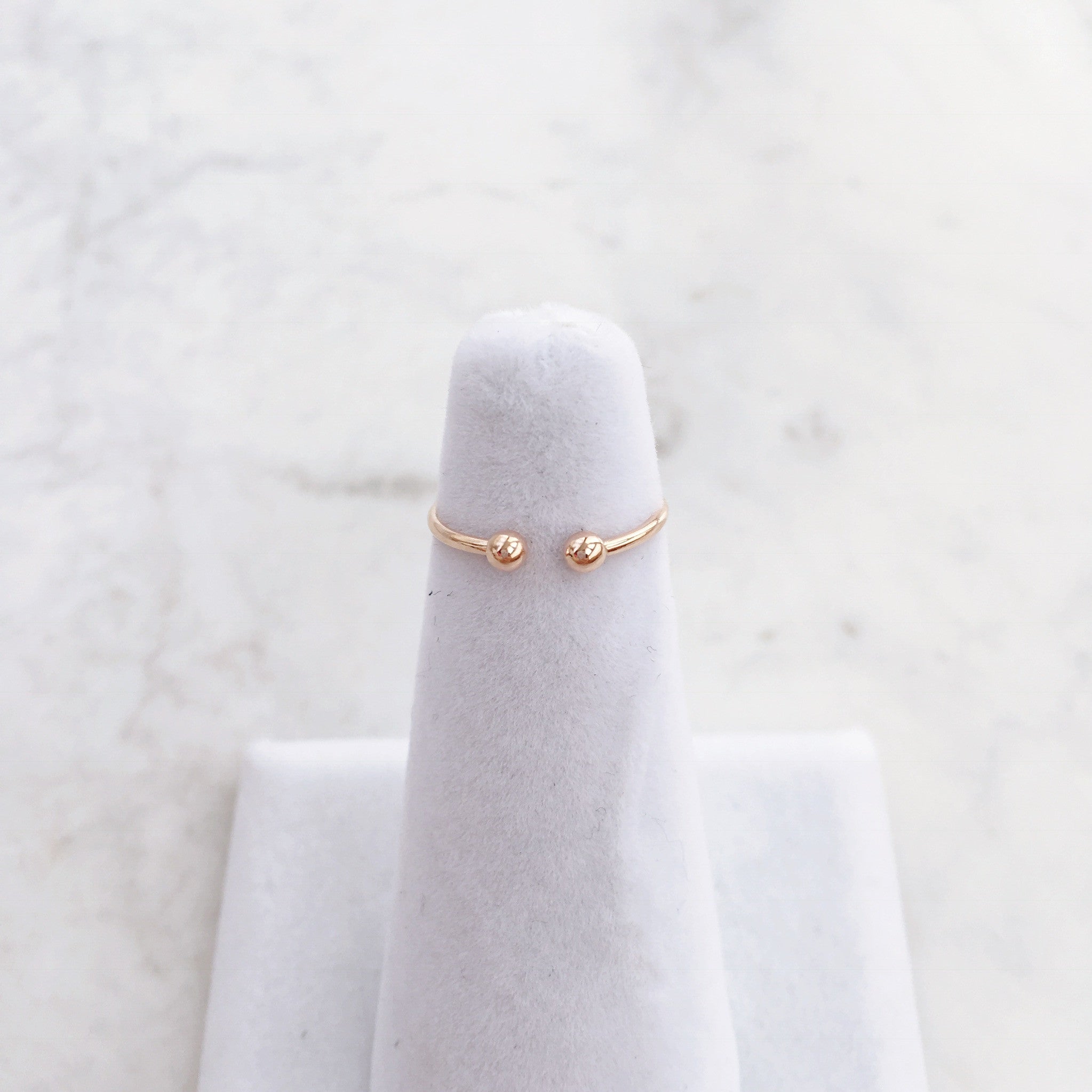 For all you ring stackers and dainty ring lovers, this Ball Midi ring is the perfect compliment or stand-alone piece for your collection. The rings feature two spheres at the ends and are slightly adjustable for your pinky finger.