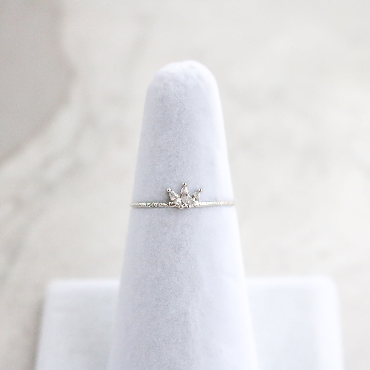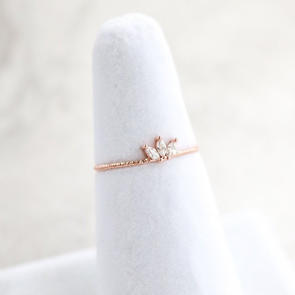 This gorgeous, timeless ring features three marquise crystal, as a stunning crown design on a dainty handmade diamond cut 0.8mm thin band.