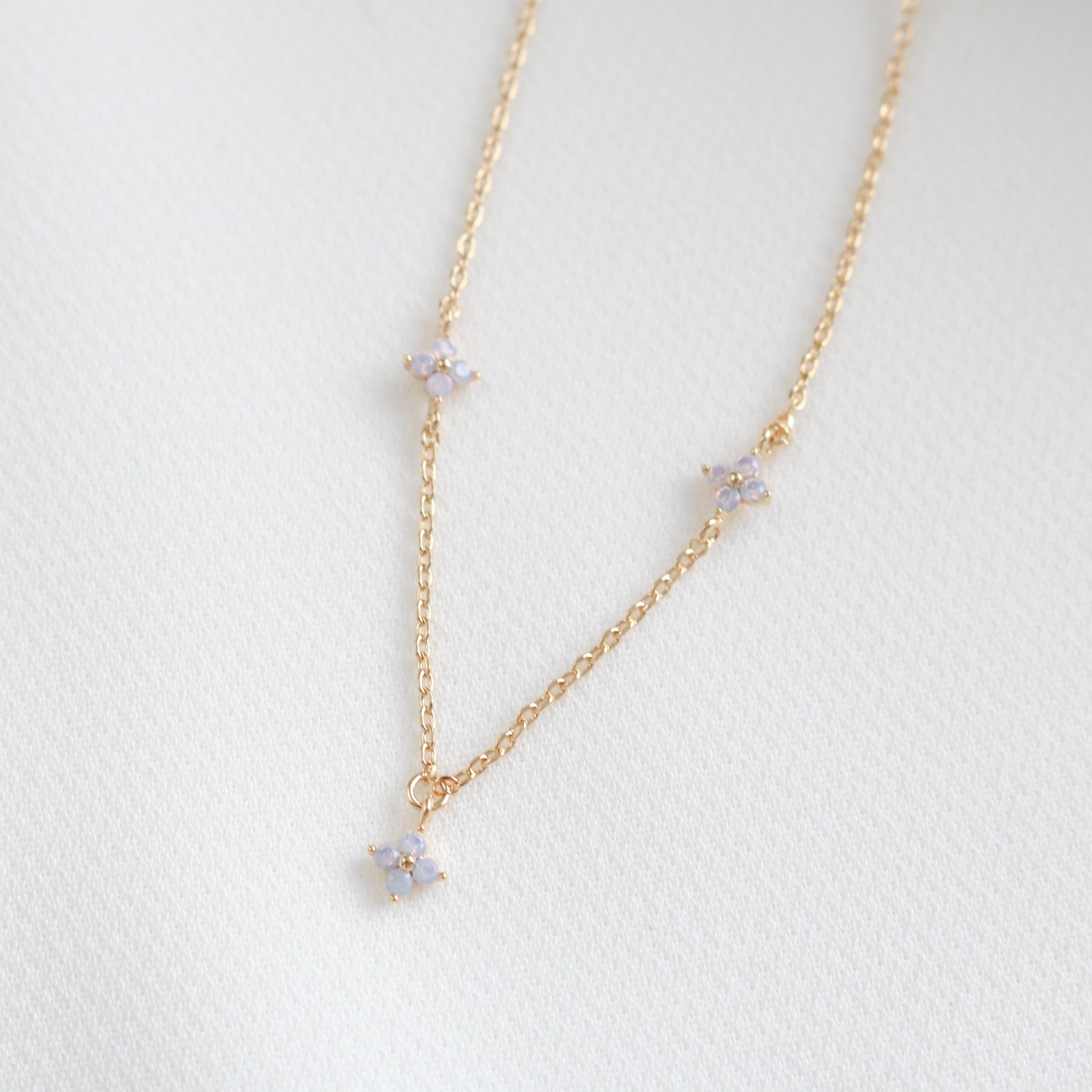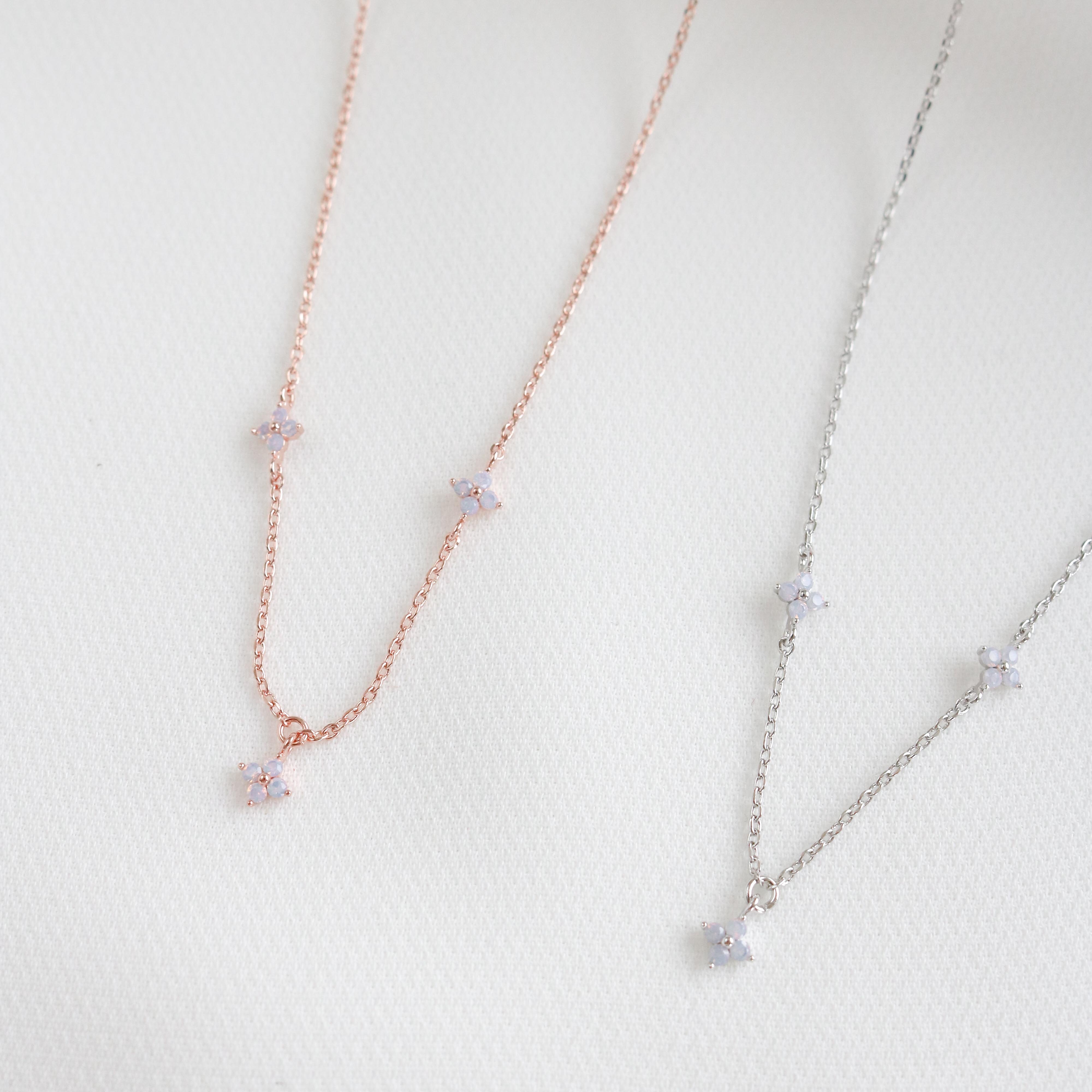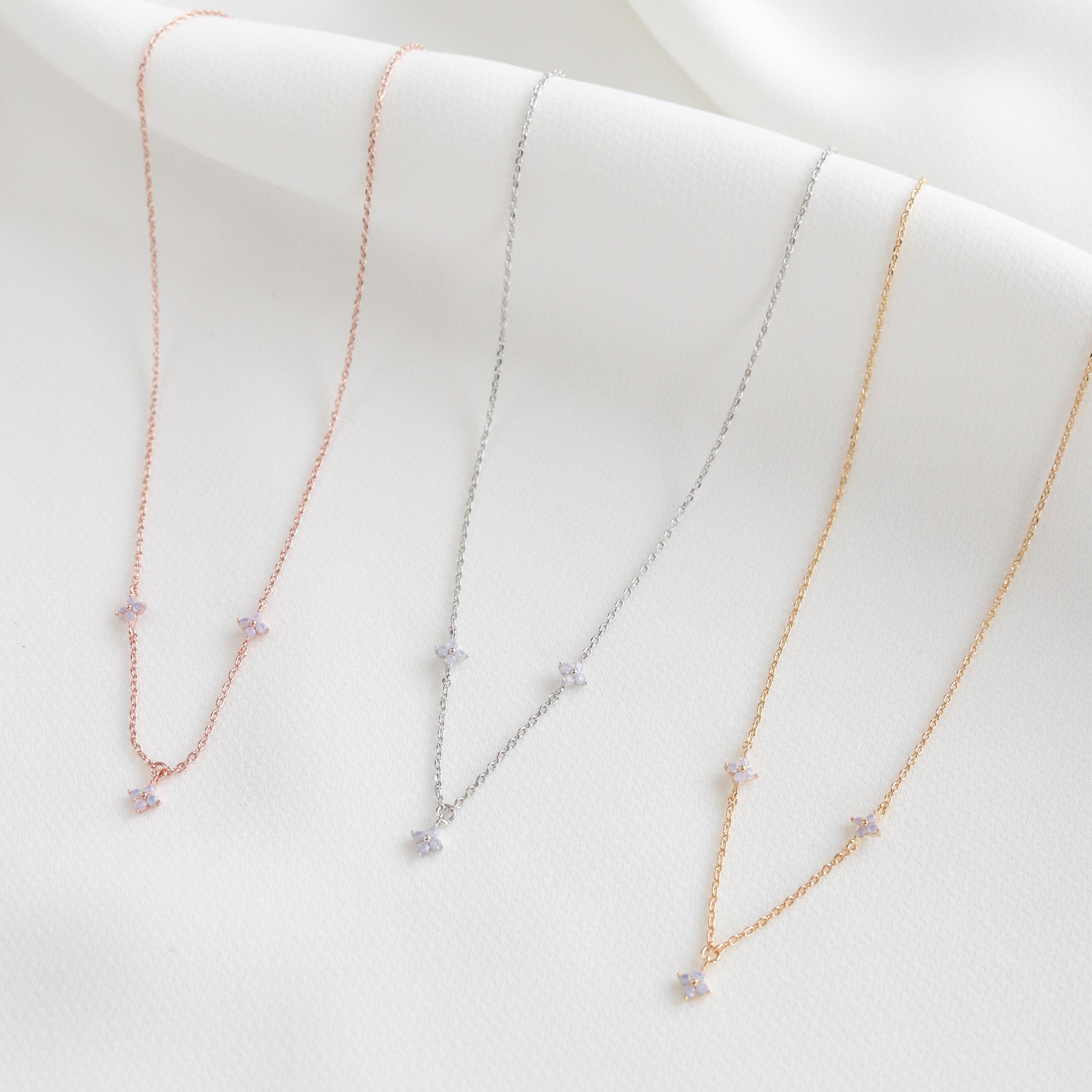 For the lovers of the cherry blossom season, this Blossom collection is for you. This charming necklaces features three blossom flowers, two on the chain and one hanging in the middle. Their pink hue stones glisten subtly in the light. The necklace is easy to layer or a must-have on its own.