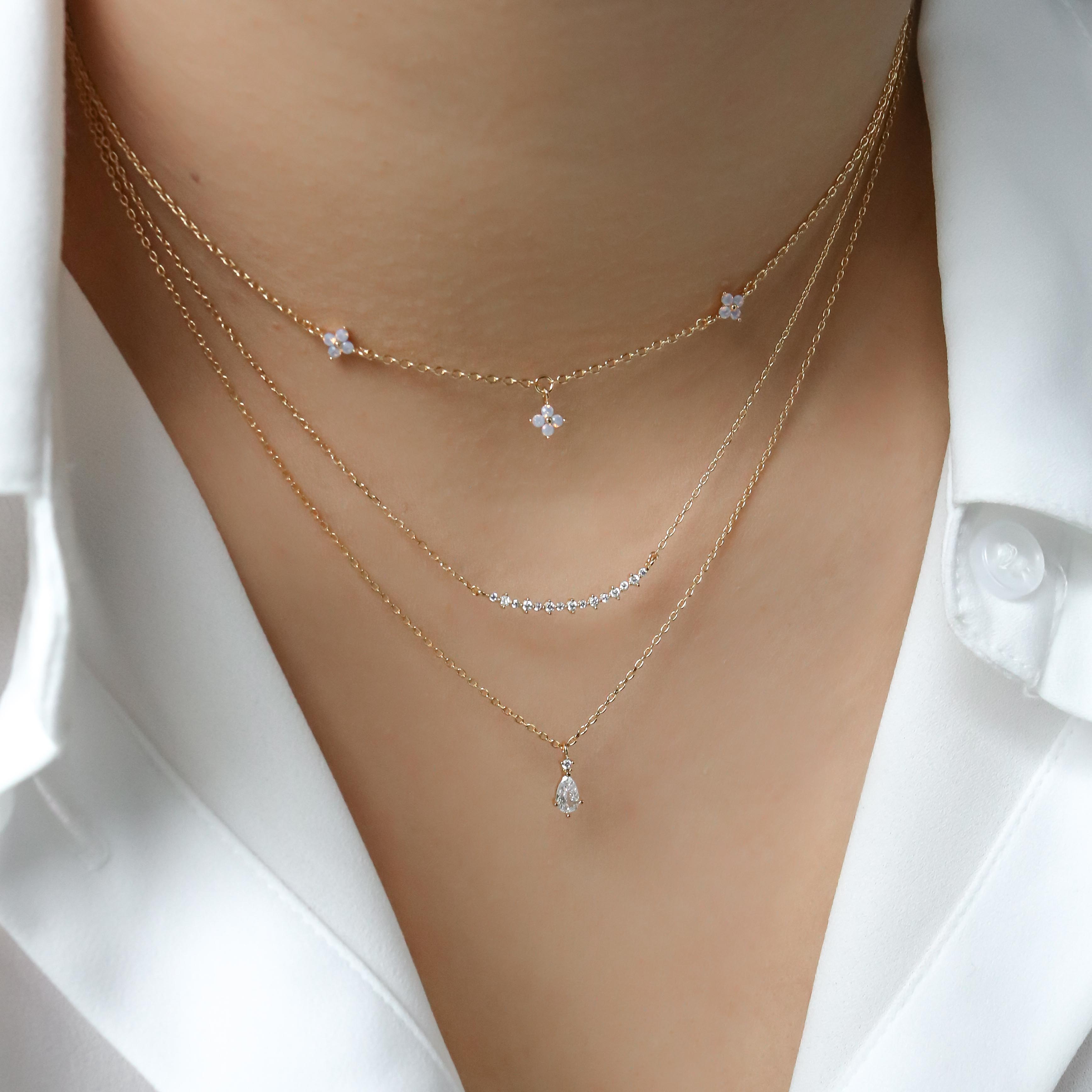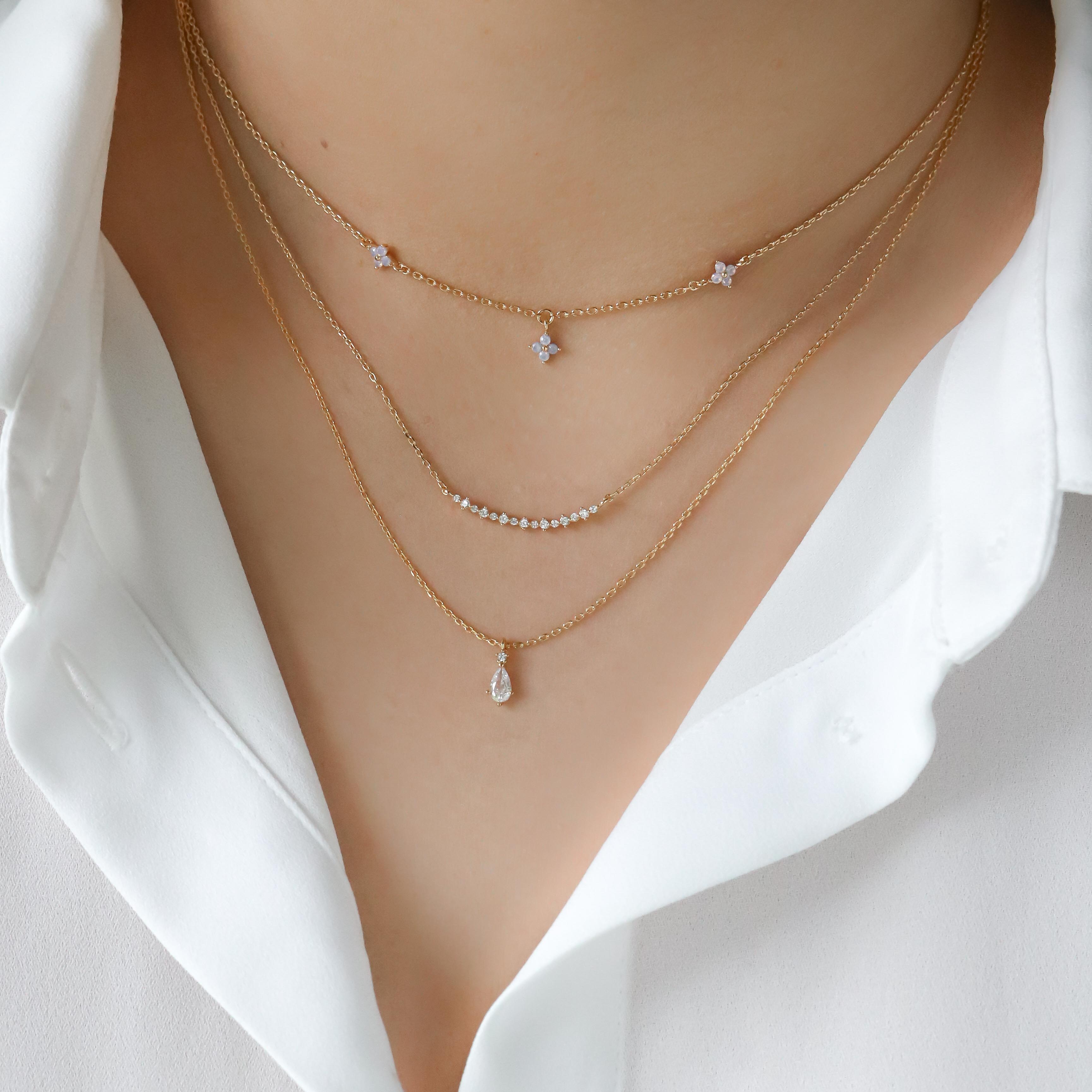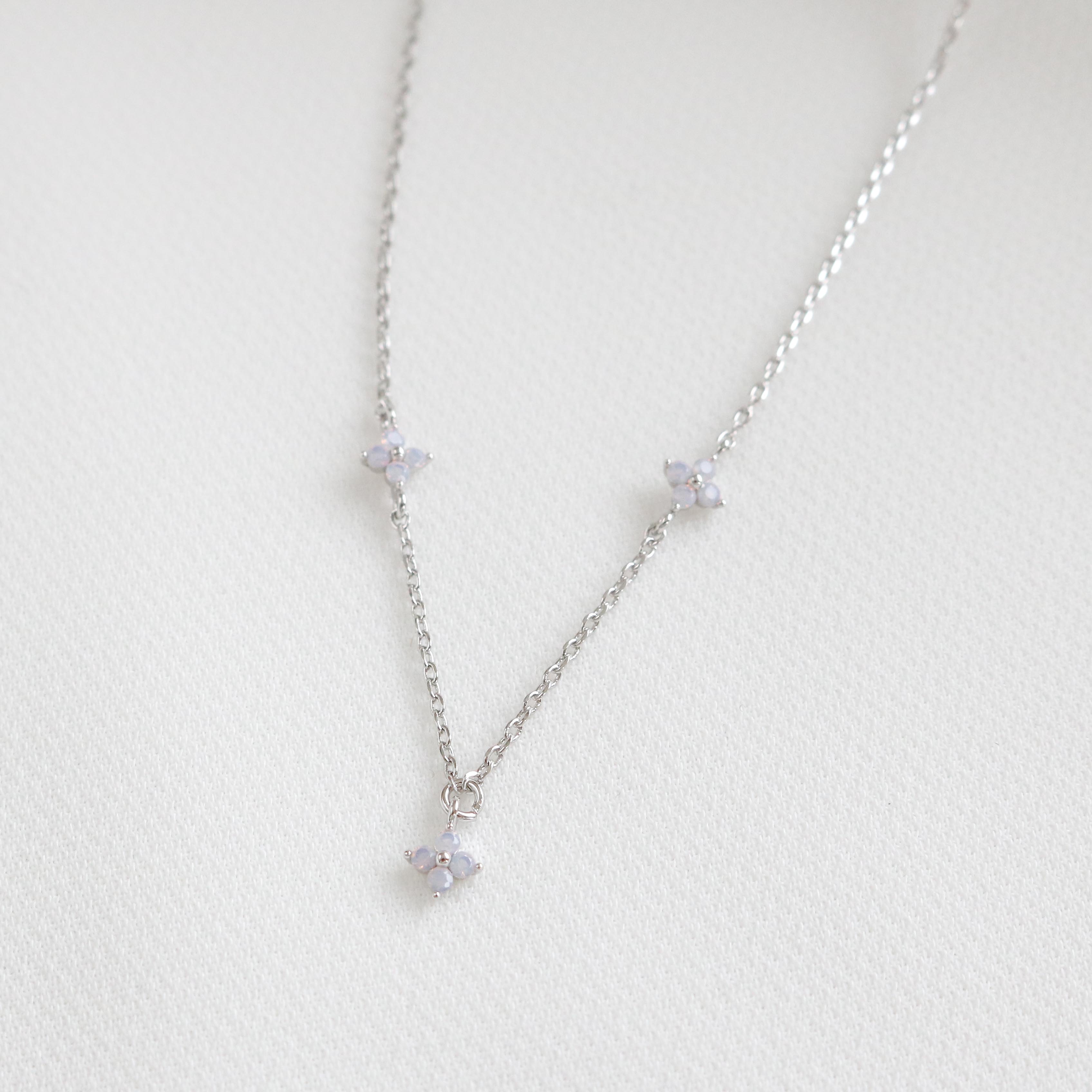 For the lovers of the cherry blossom season, this Blossom collection is for you. This charming necklaces features three blossom flowers, two on the chain and one hanging in the middle. Their pink hue stones glisten subtly in the light. The necklace is easy to layer or a must-have on its own.