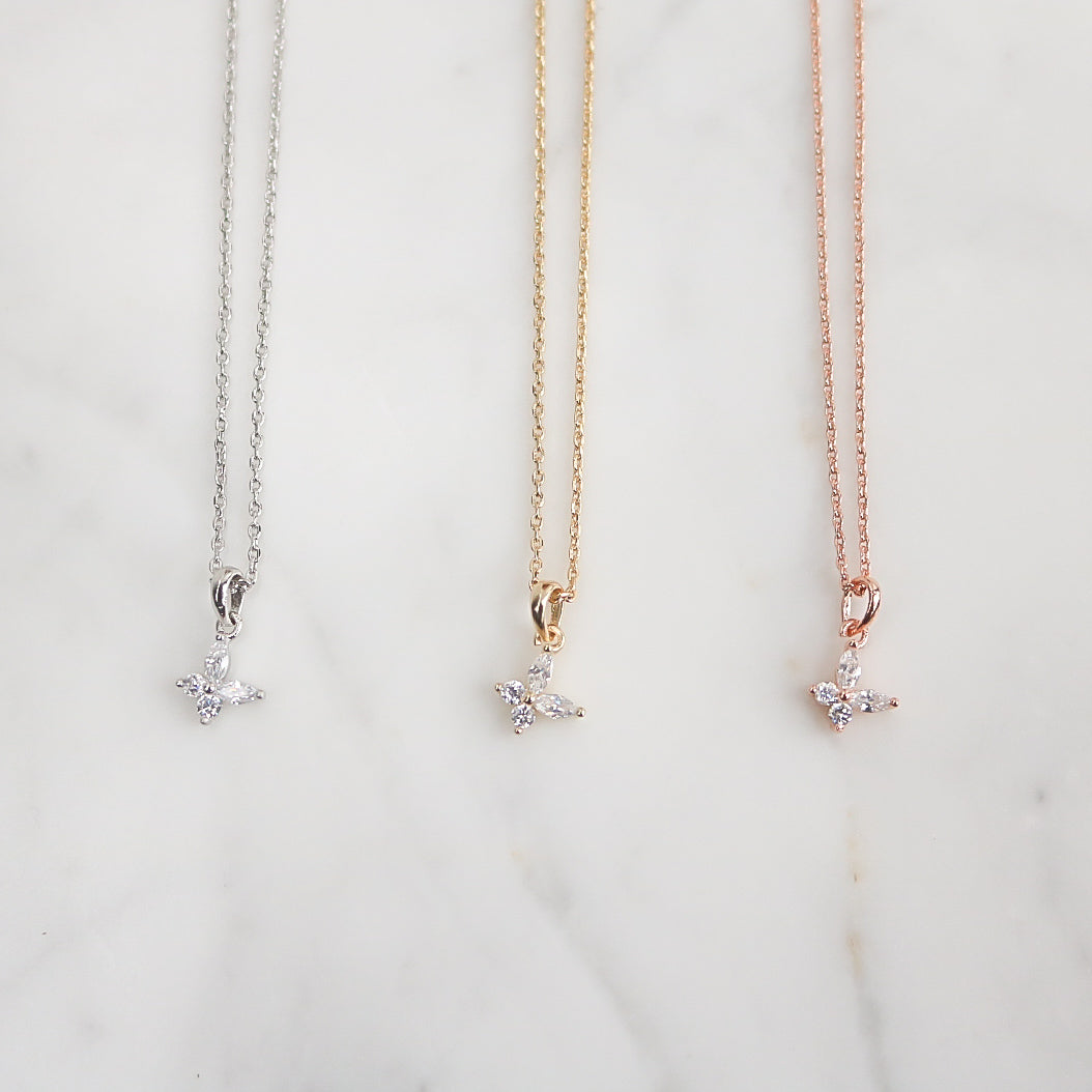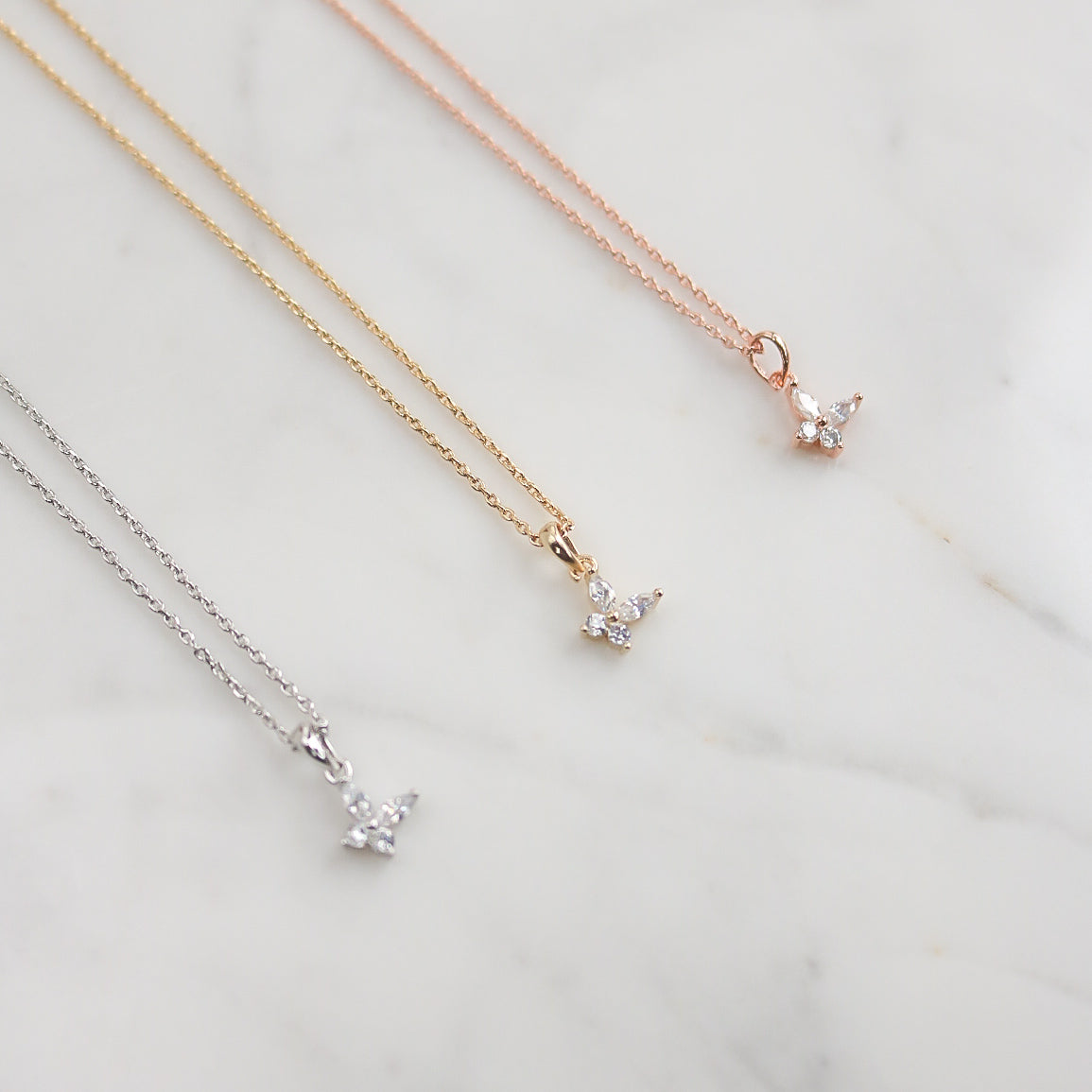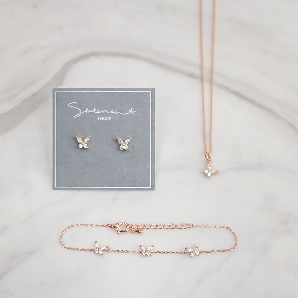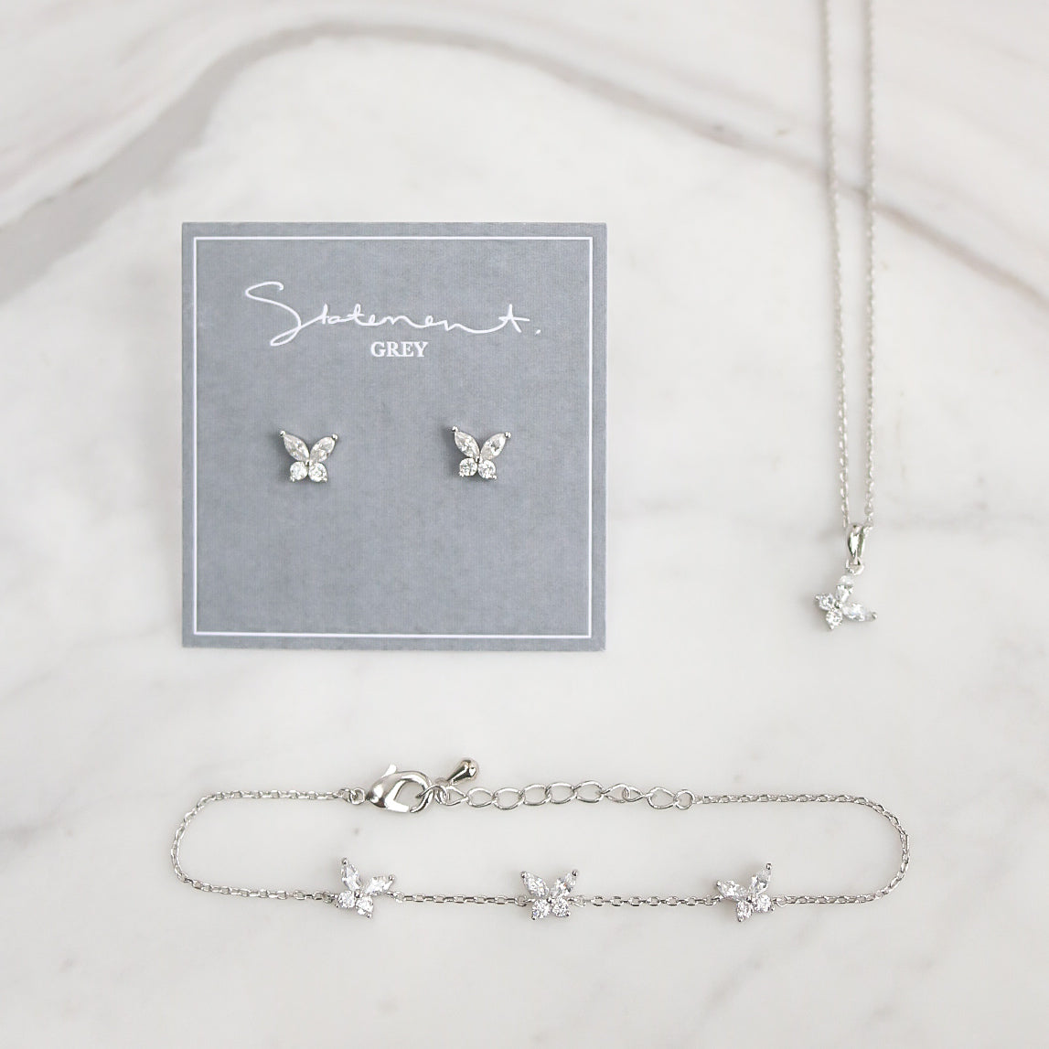 Already becoming one of our top selling necklaces, this gem features a butterfly design composed of our signature marquise and circle crystals that dances on your neck. Try our matching earrings and bracelet for the full set!