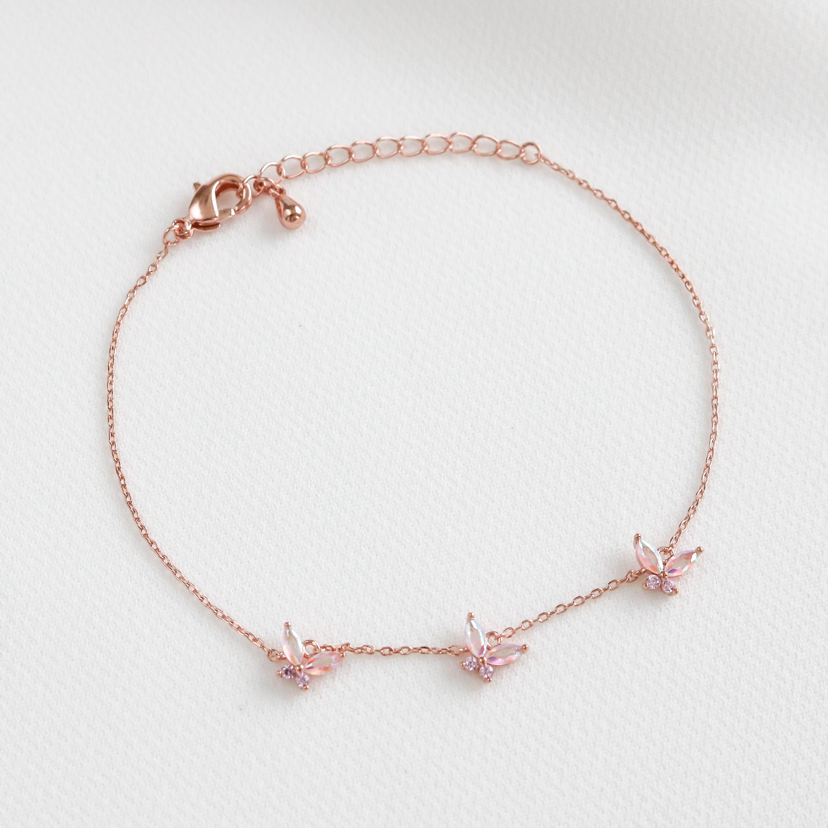 The Iridescent Butterfly bracelet pairs marquise and circle crystals to form three beautiful butterflies resting on your wrist. The crystals are iridescent so these charming wonders will be buzzing with colour from all angles!