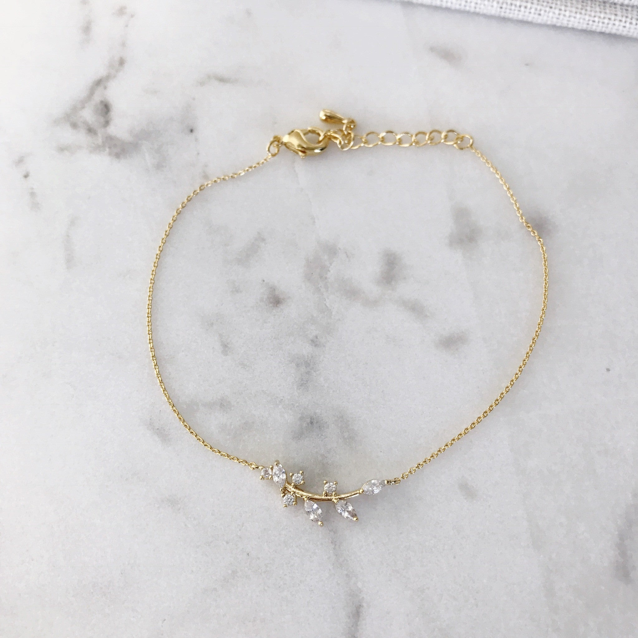 This nature themed bracelet has a thin, delicate chain with a crystal encrusted leaf branch design. This bracelet is beautiful and eye-catching.