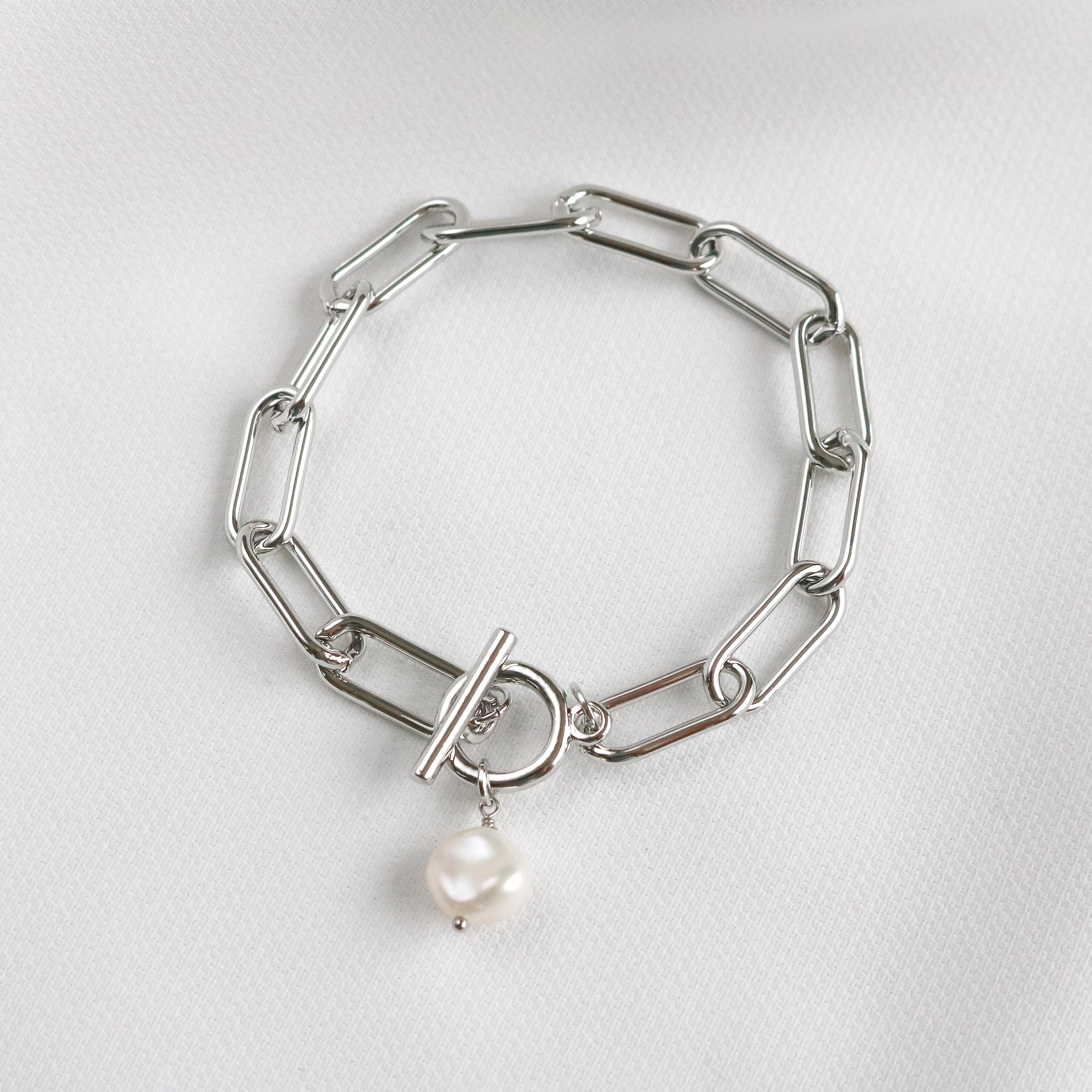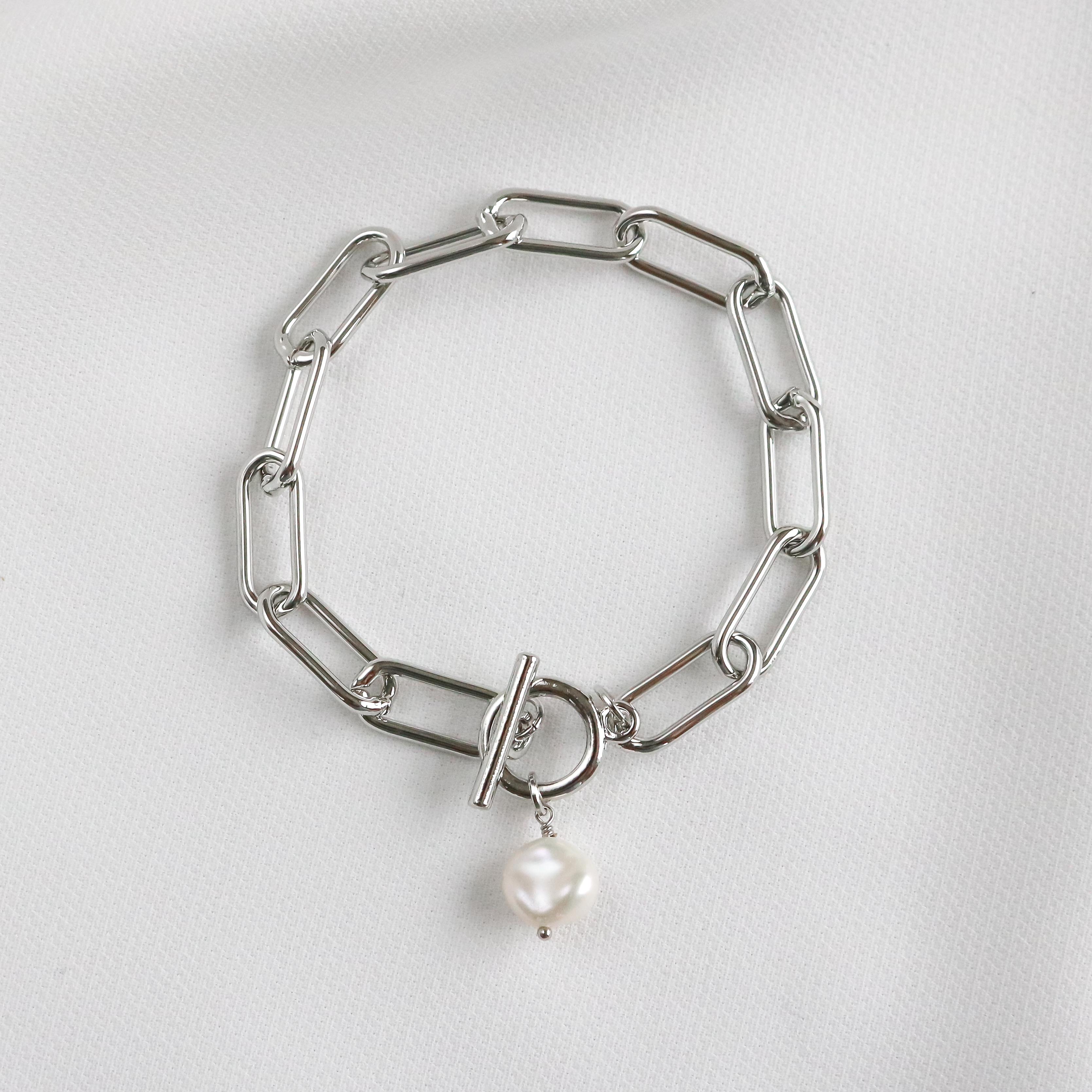 The Leon Bracelet features the stylish link chain completed with a bar and toggle closure, and finished with a fresh water pearl.