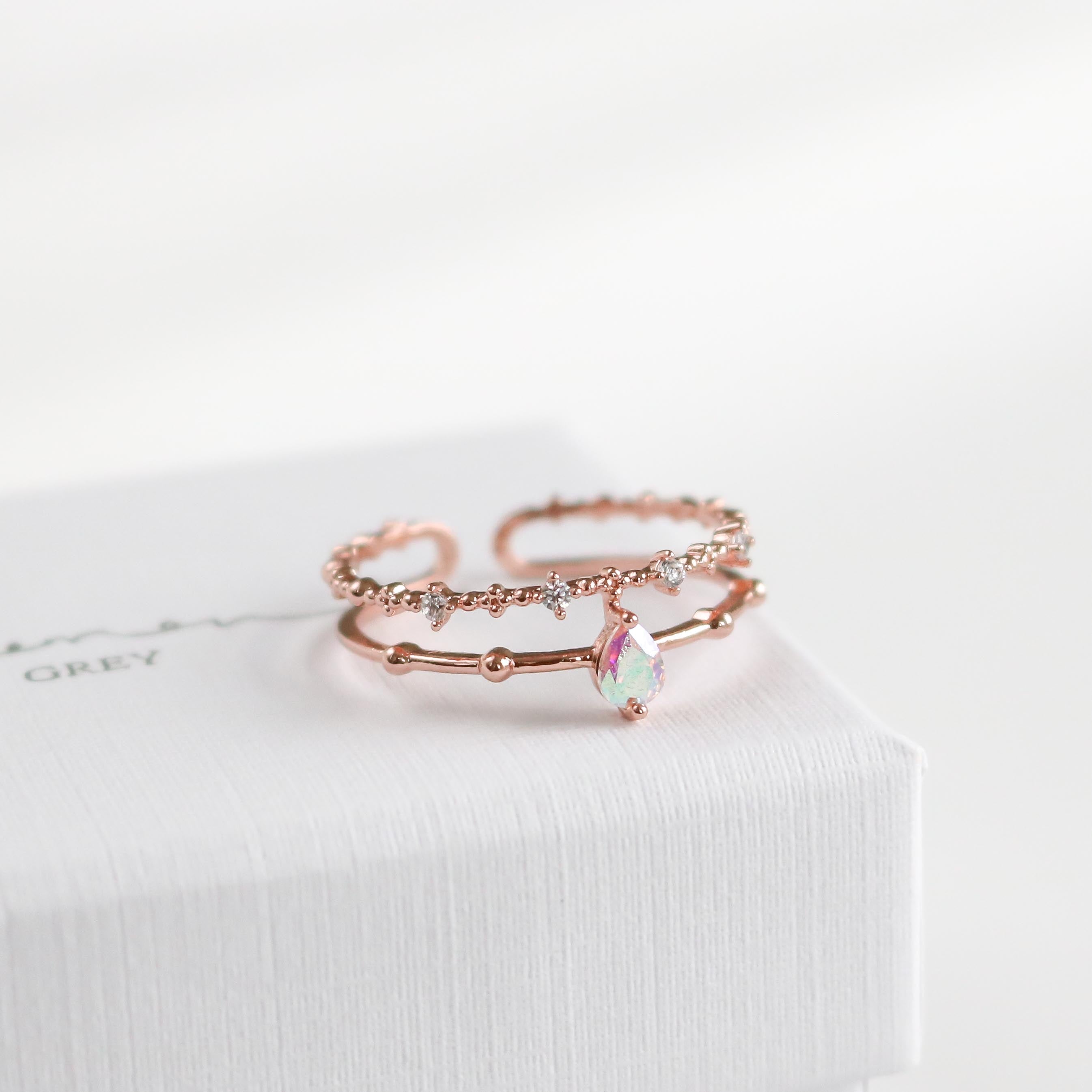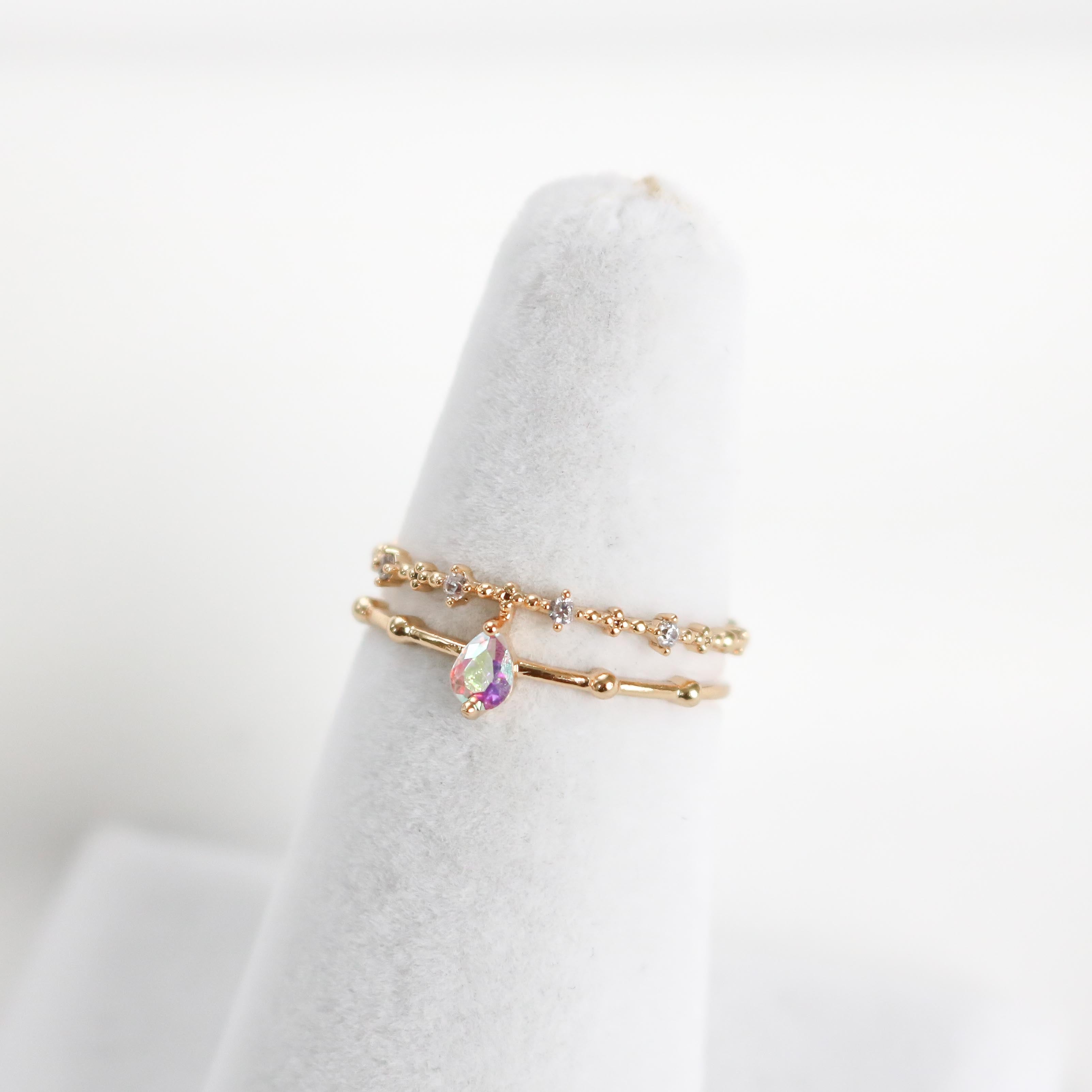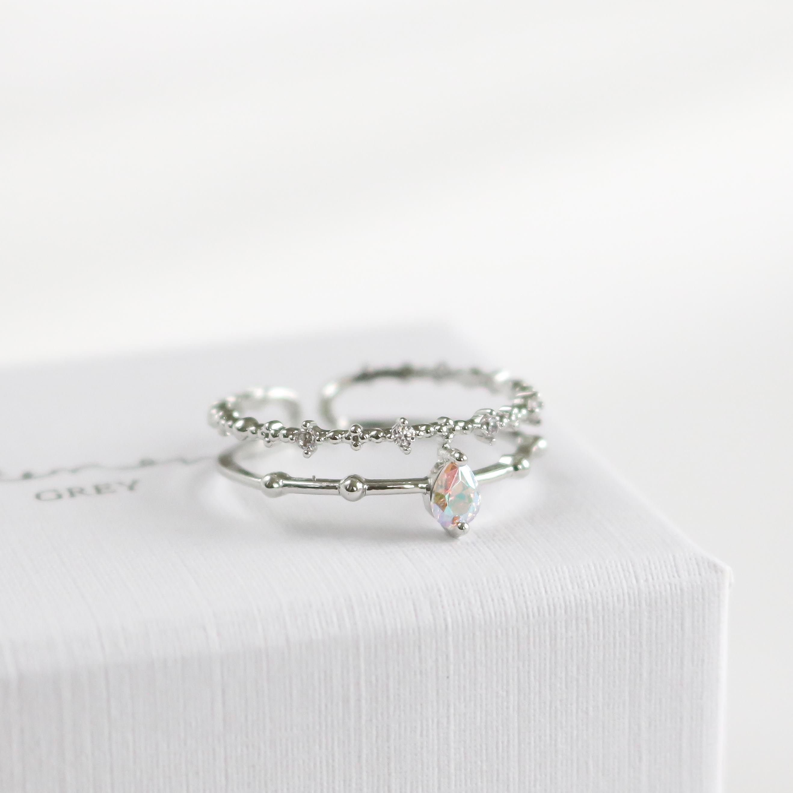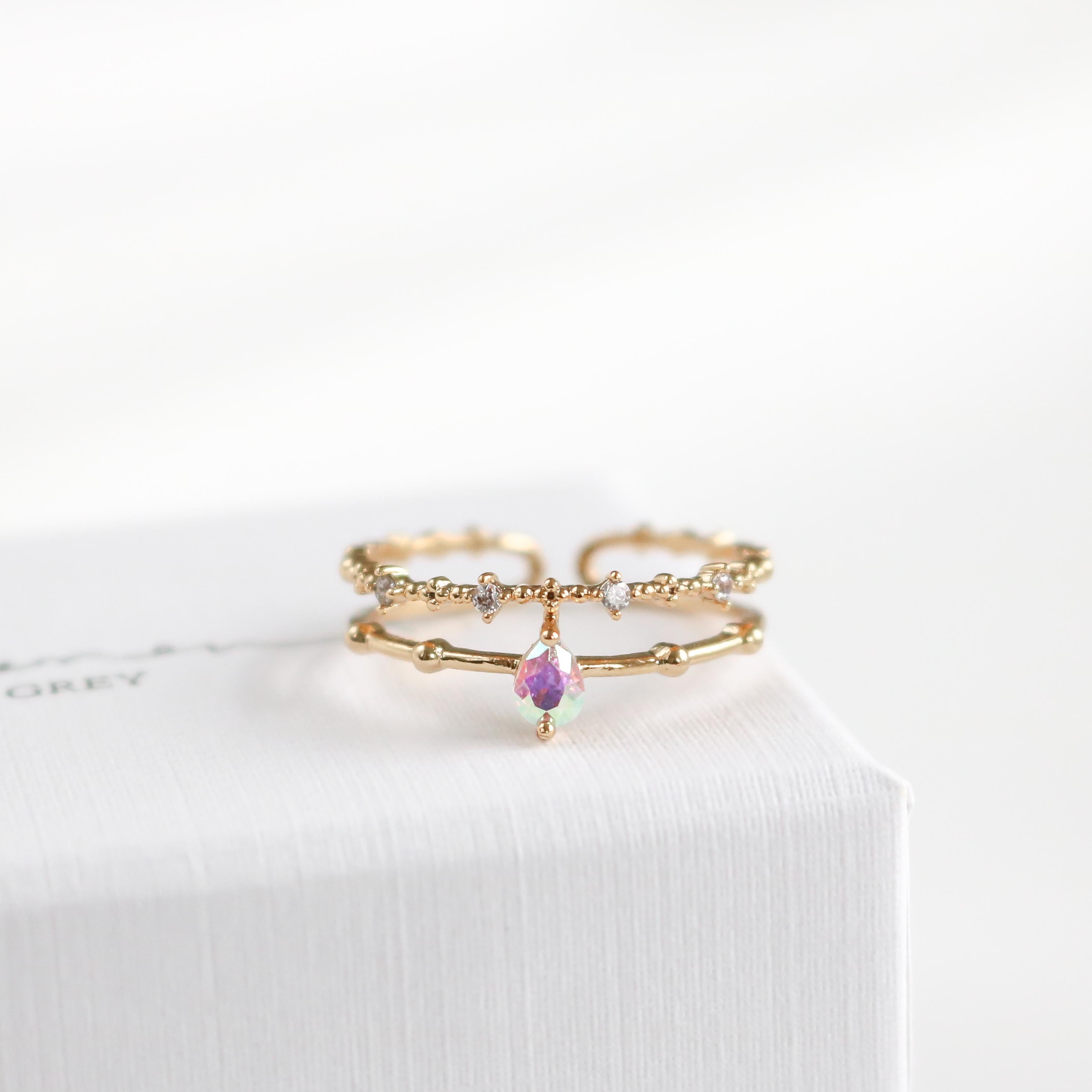 This dreamy, ultra charming ring features a double band that highlights an iridescent teardrop crystal and finished with a beaded crystal detailed band.