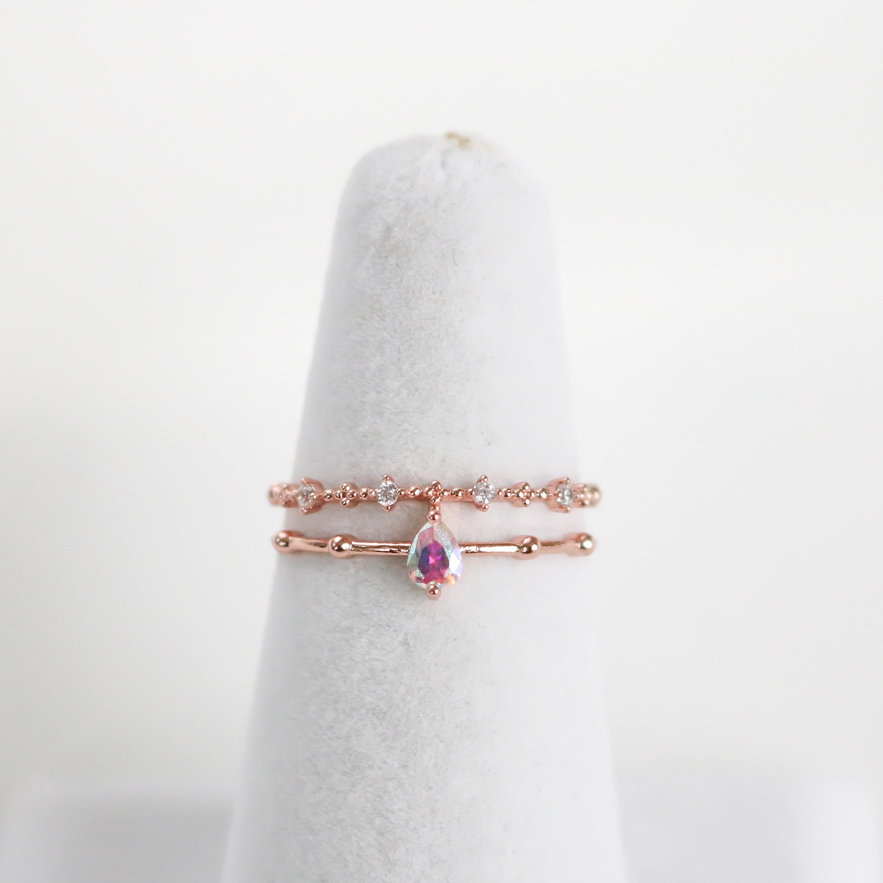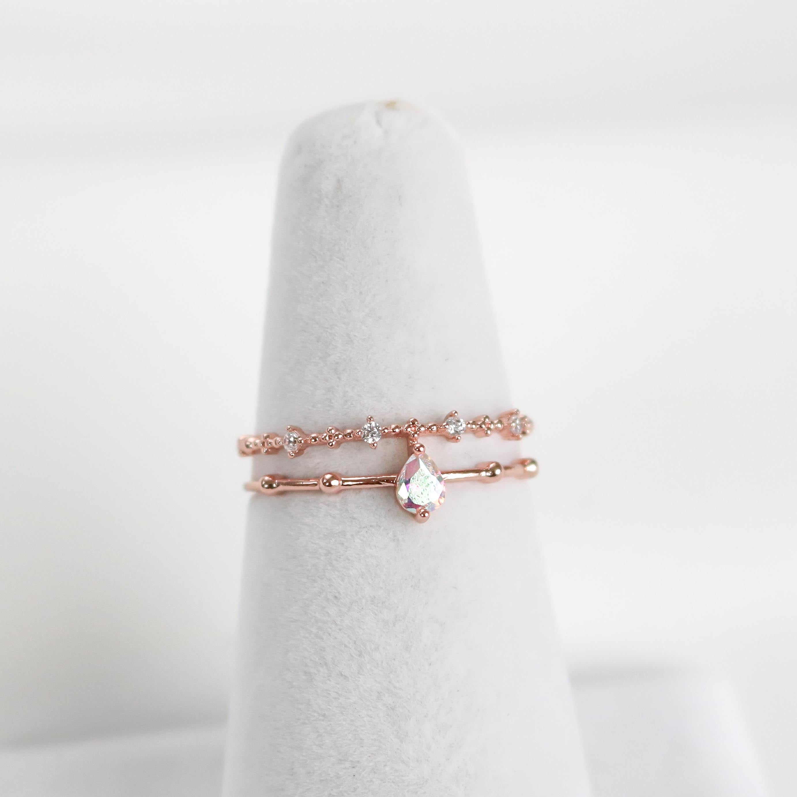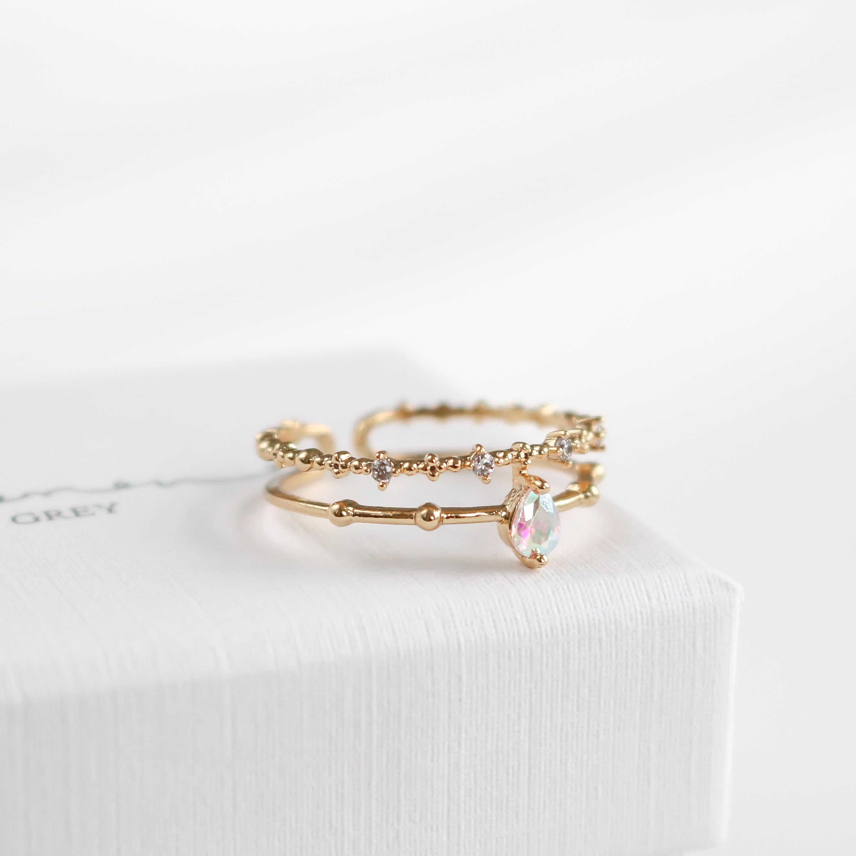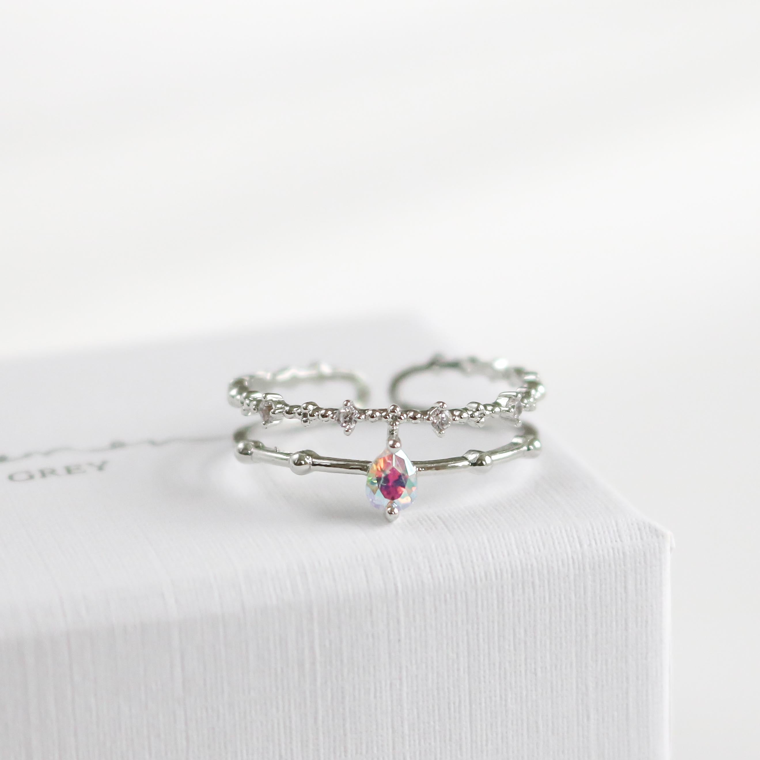This dreamy, ultra charming ring features a double band that highlights an iridescent teardrop crystal and finished with a beaded crystal detailed band.