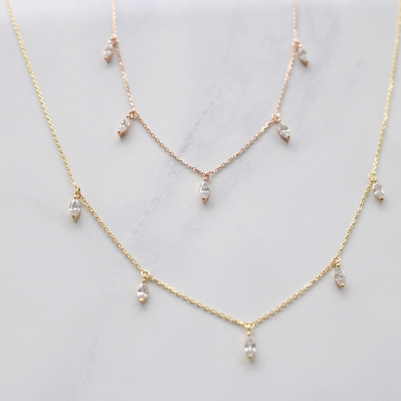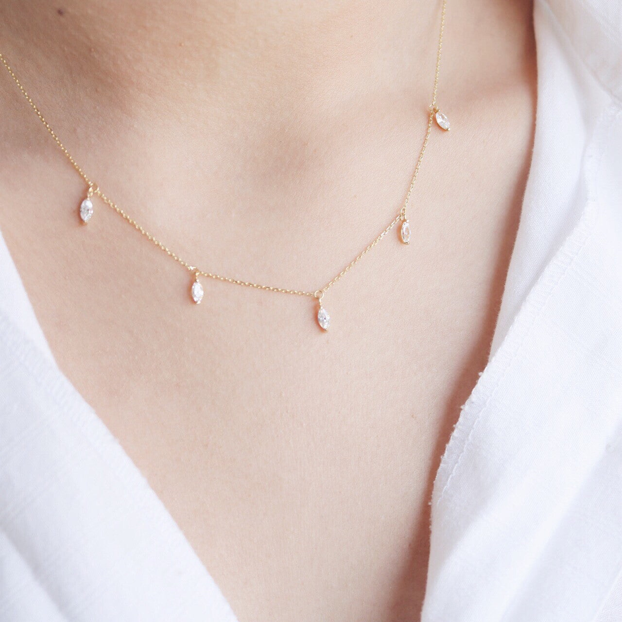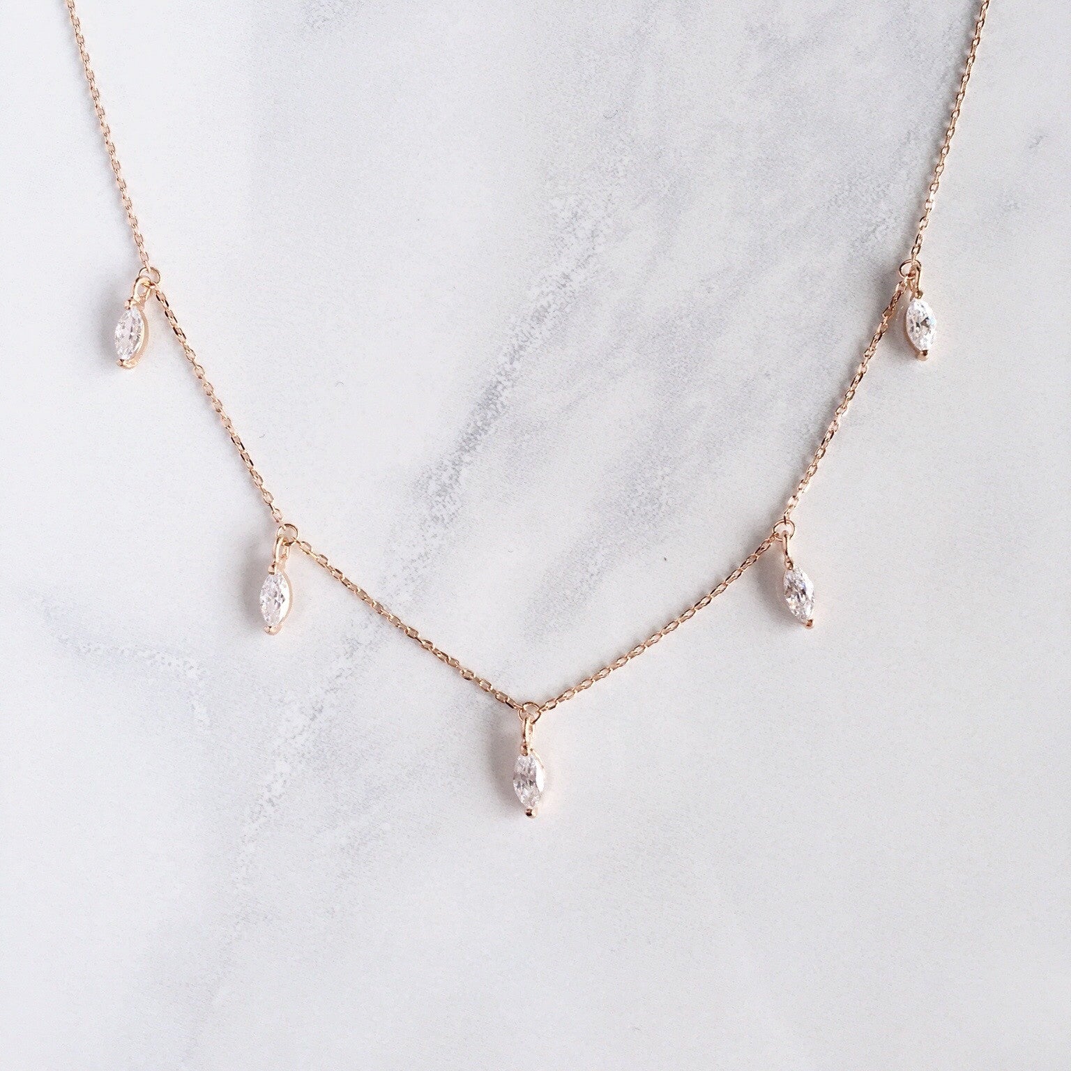 Elegant and fashionable, the delicate Marquise Crystal necklace showcases its high-quality Sterling Silver with five marquise pendants. Perfect for layering or gift recommendation for that special someone in your life (i.e., mom, sister, or surprising the wife). Completed with a small crystal pendant in the back so you sparkle from all sides.