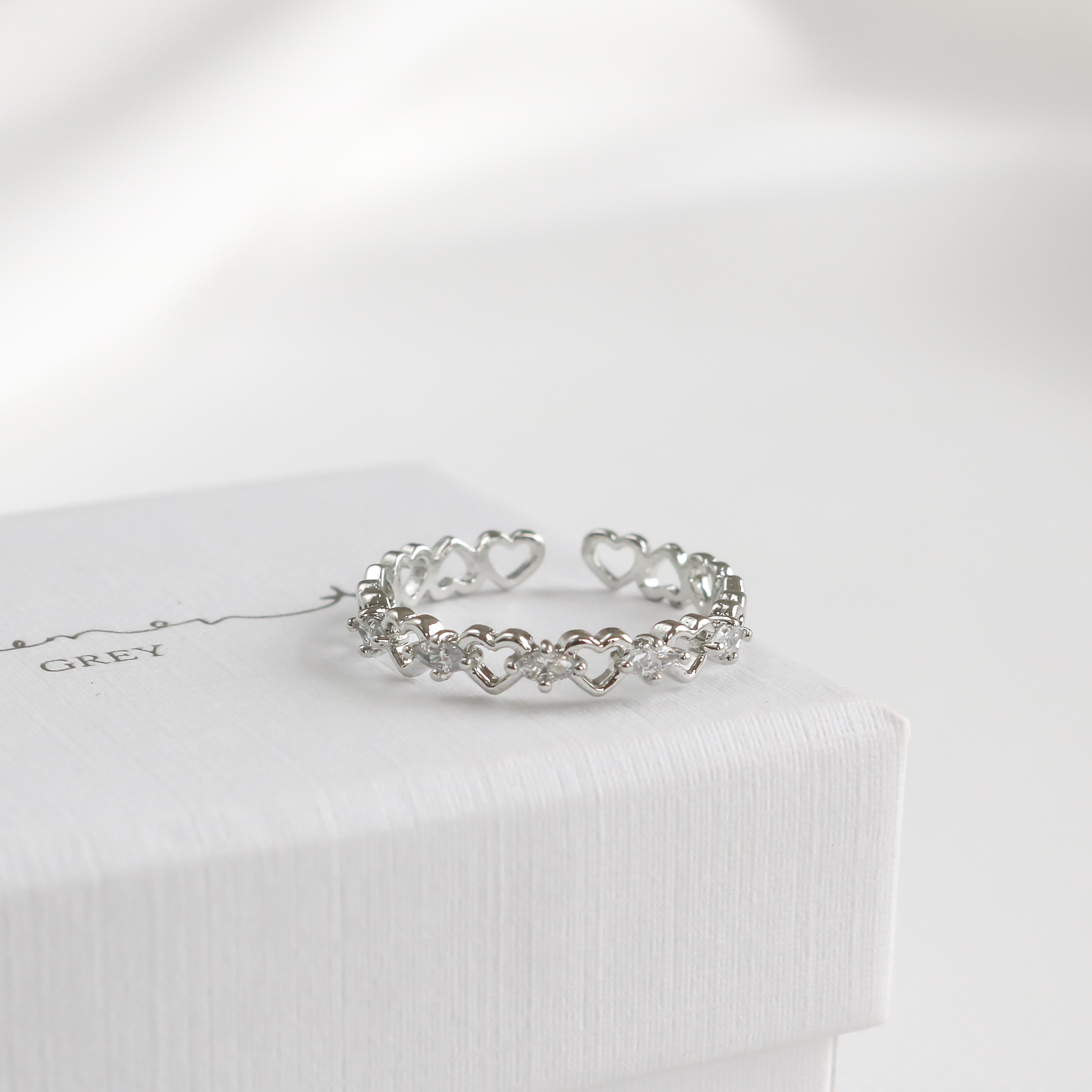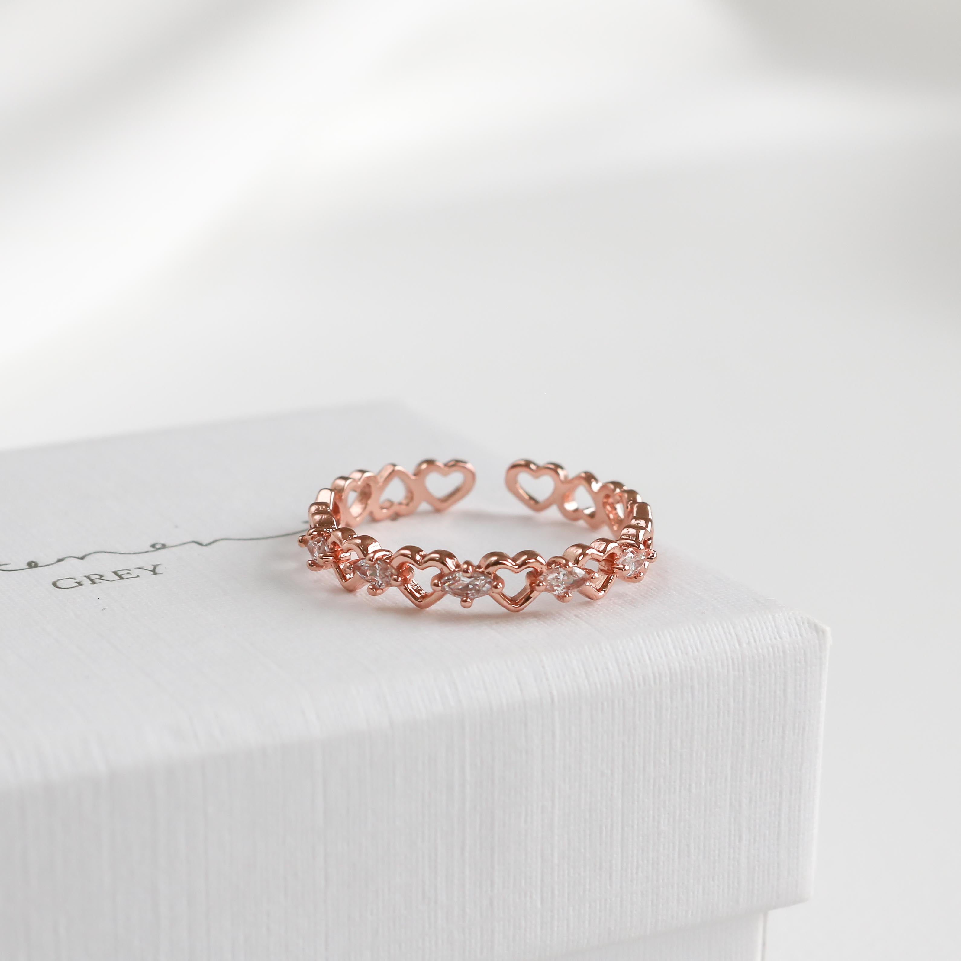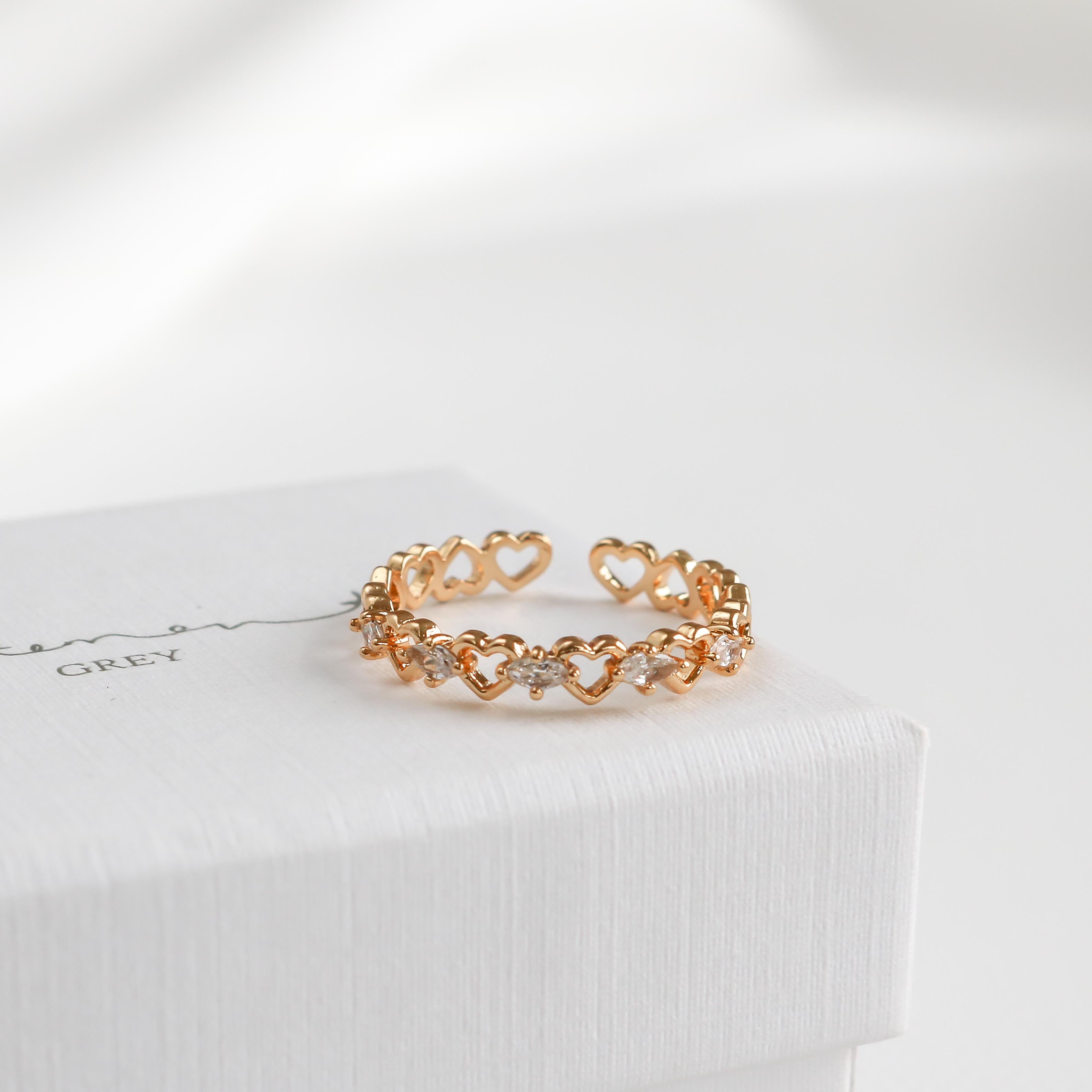 The Marquise Heart Ring showcases marquise crystals and hearts in an alternating design in the front that is finished with a slightly adjustable band of hearts.