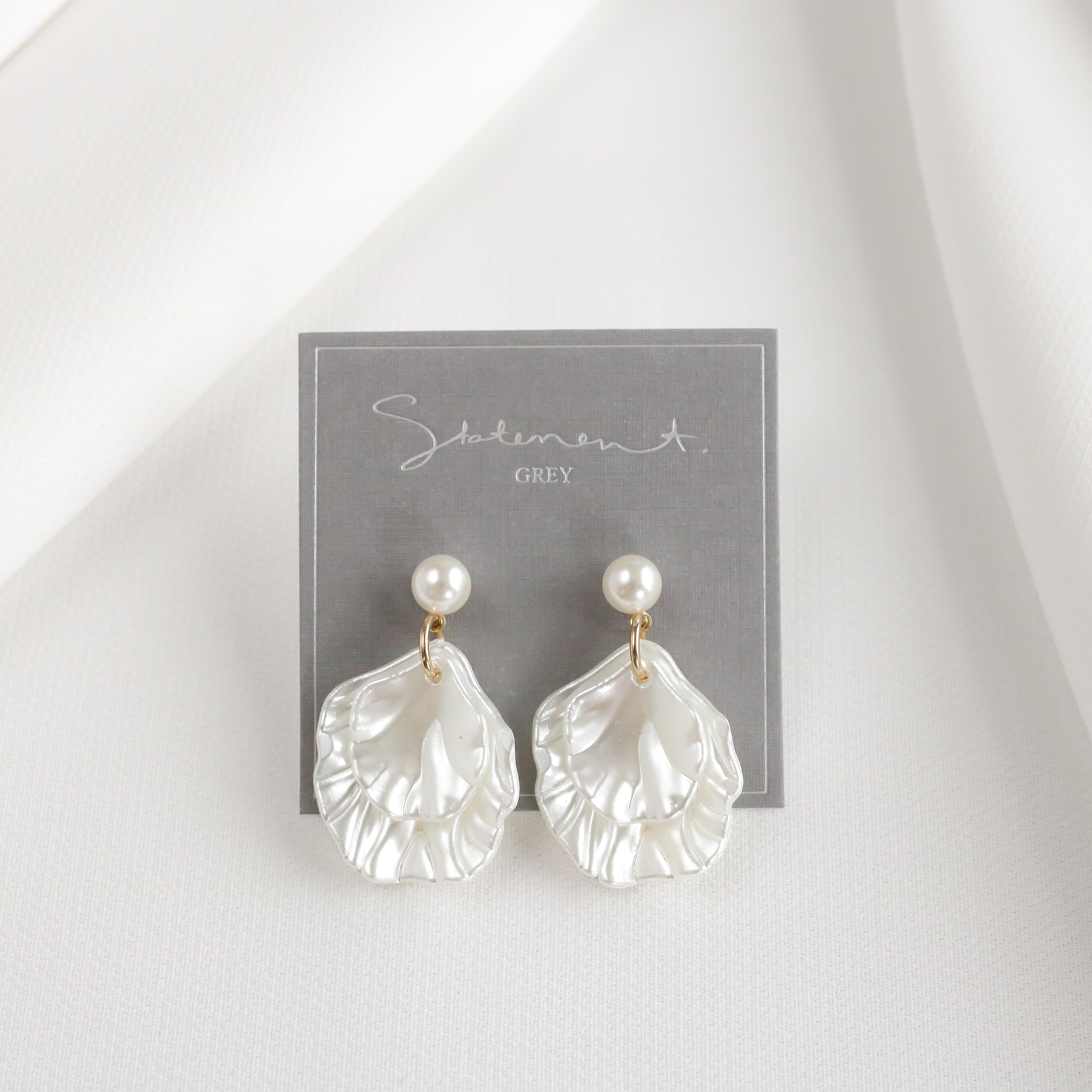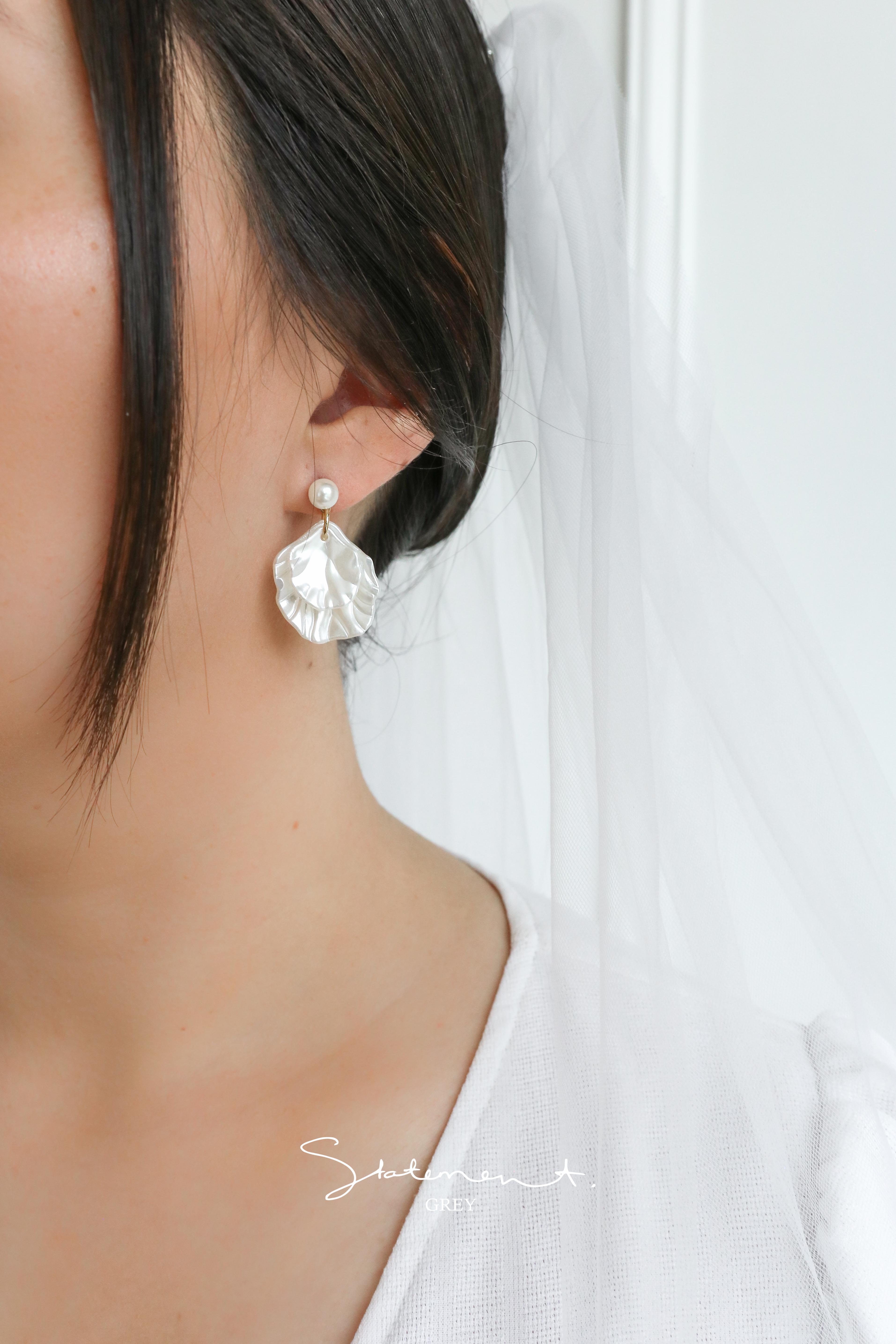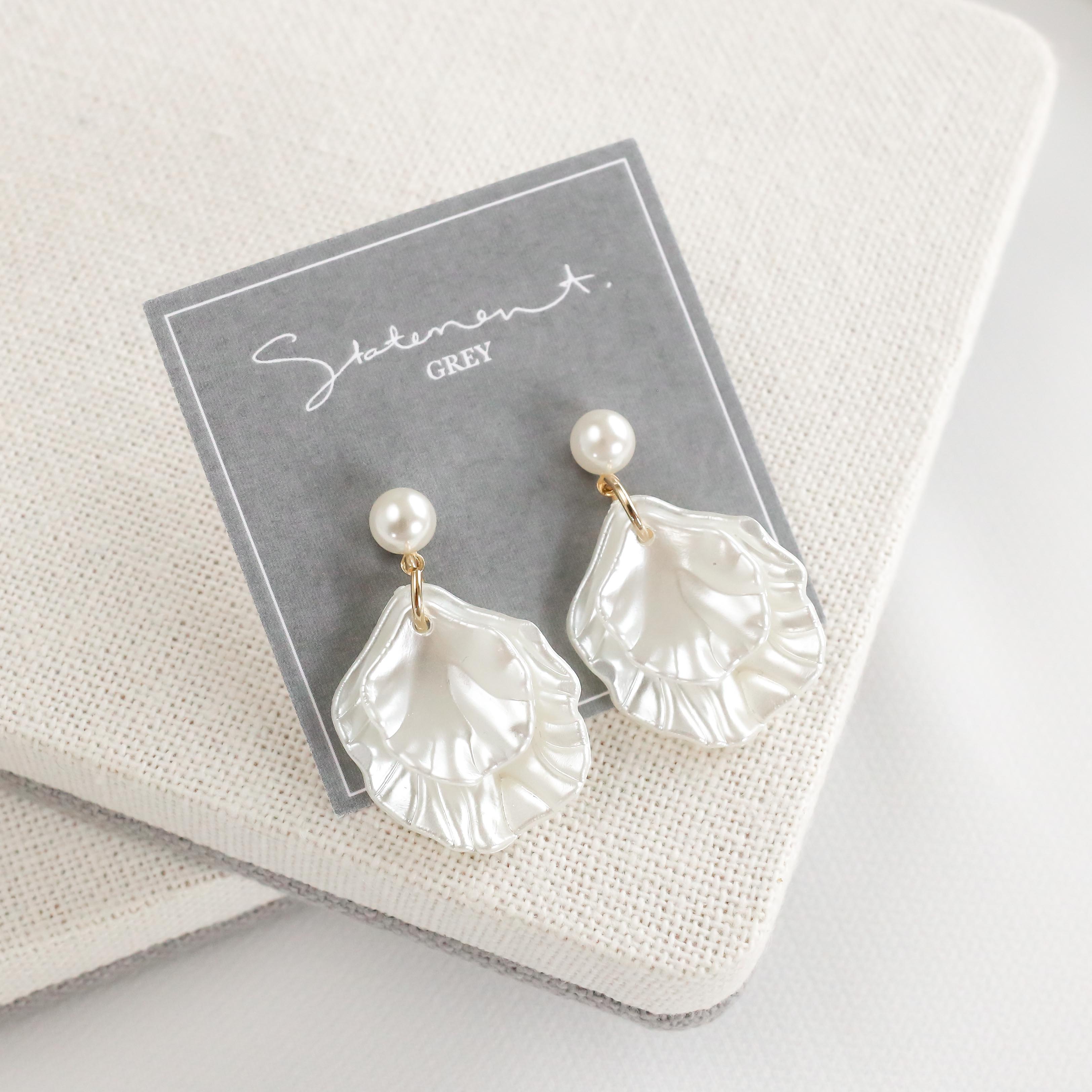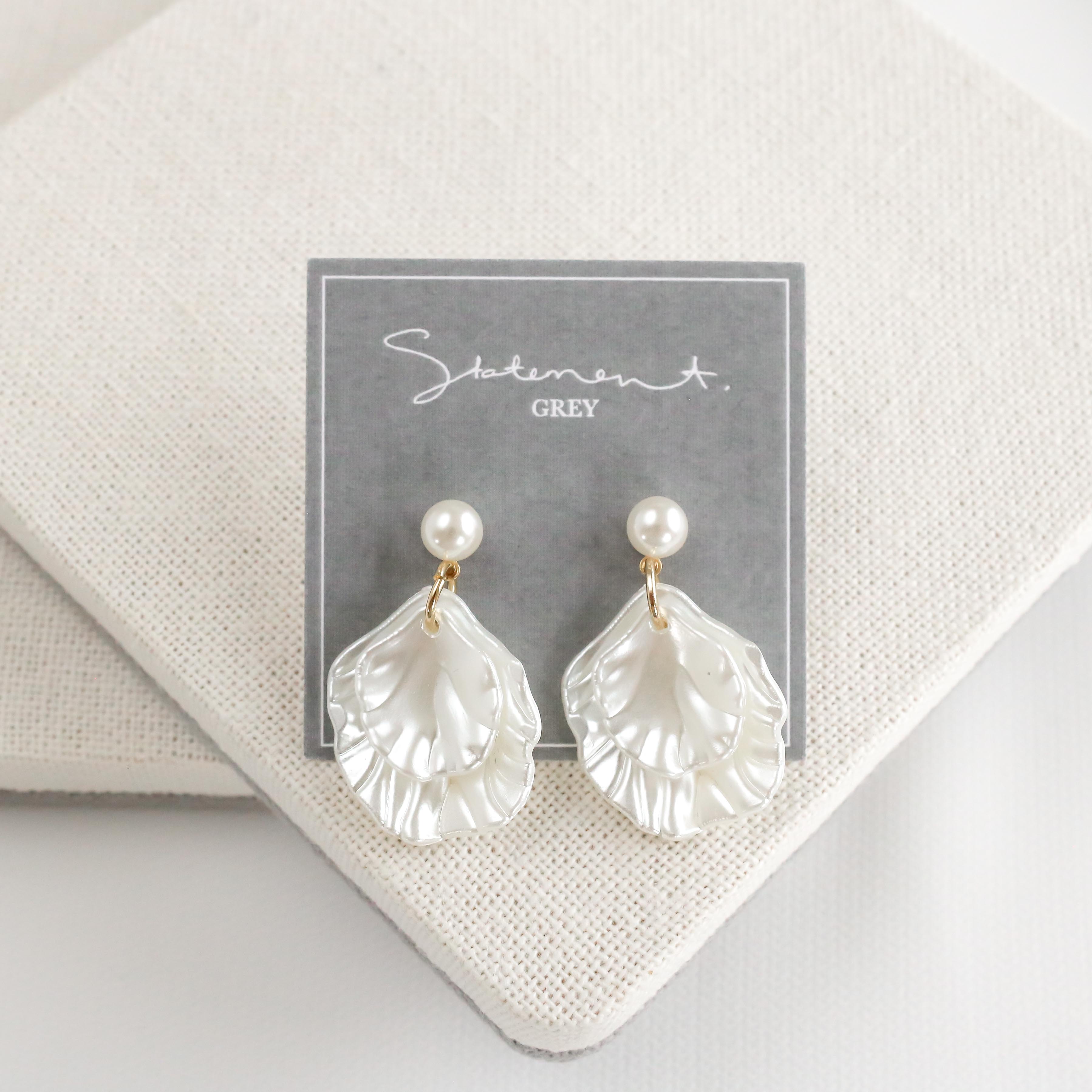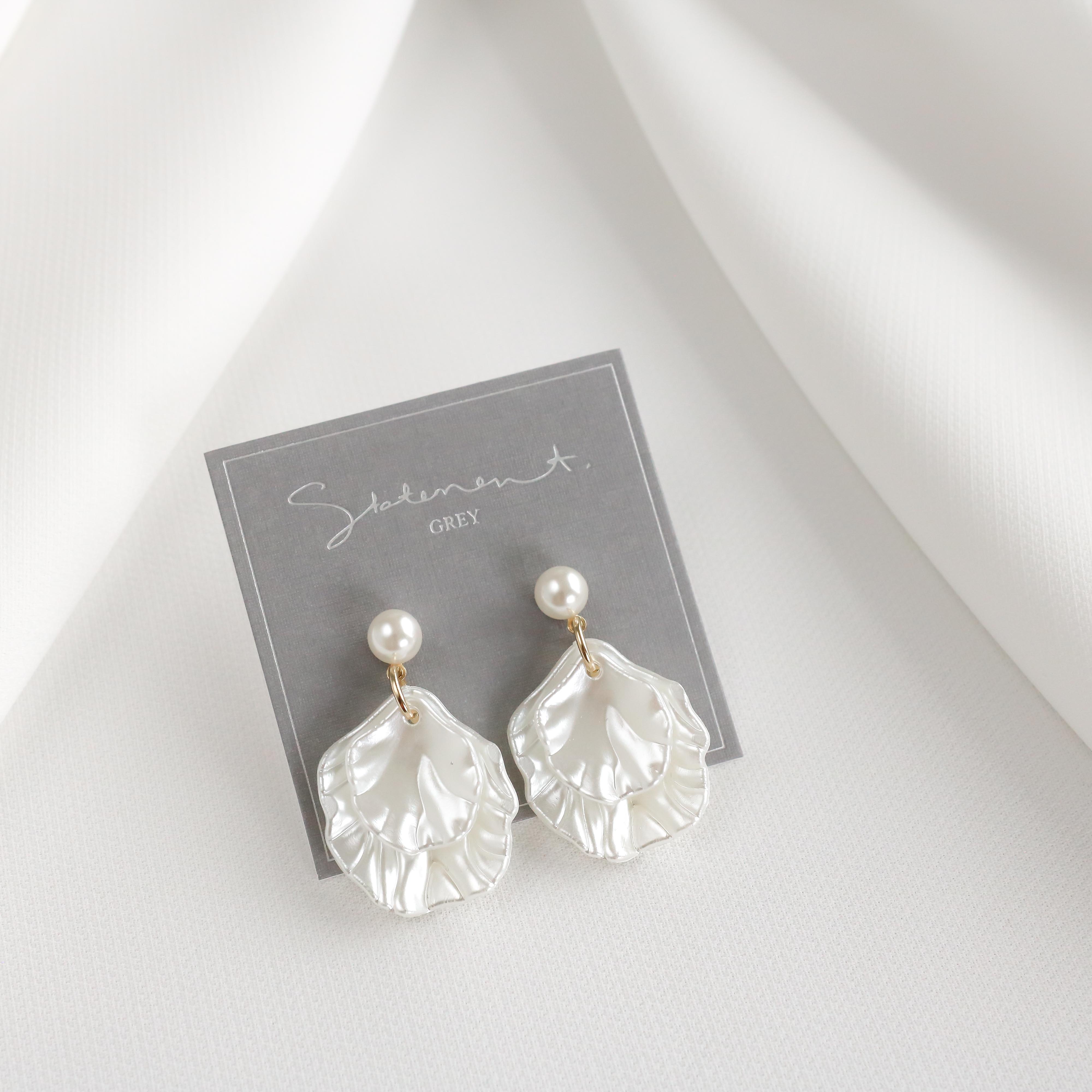Introducing our Pearl Petal Drop Earrings - two dainty petals elegantly suspended from a classic pearl earring with a touch of gold. Perfect for brides and bridesmaids alike, these earrings offer a timeless and refined look.