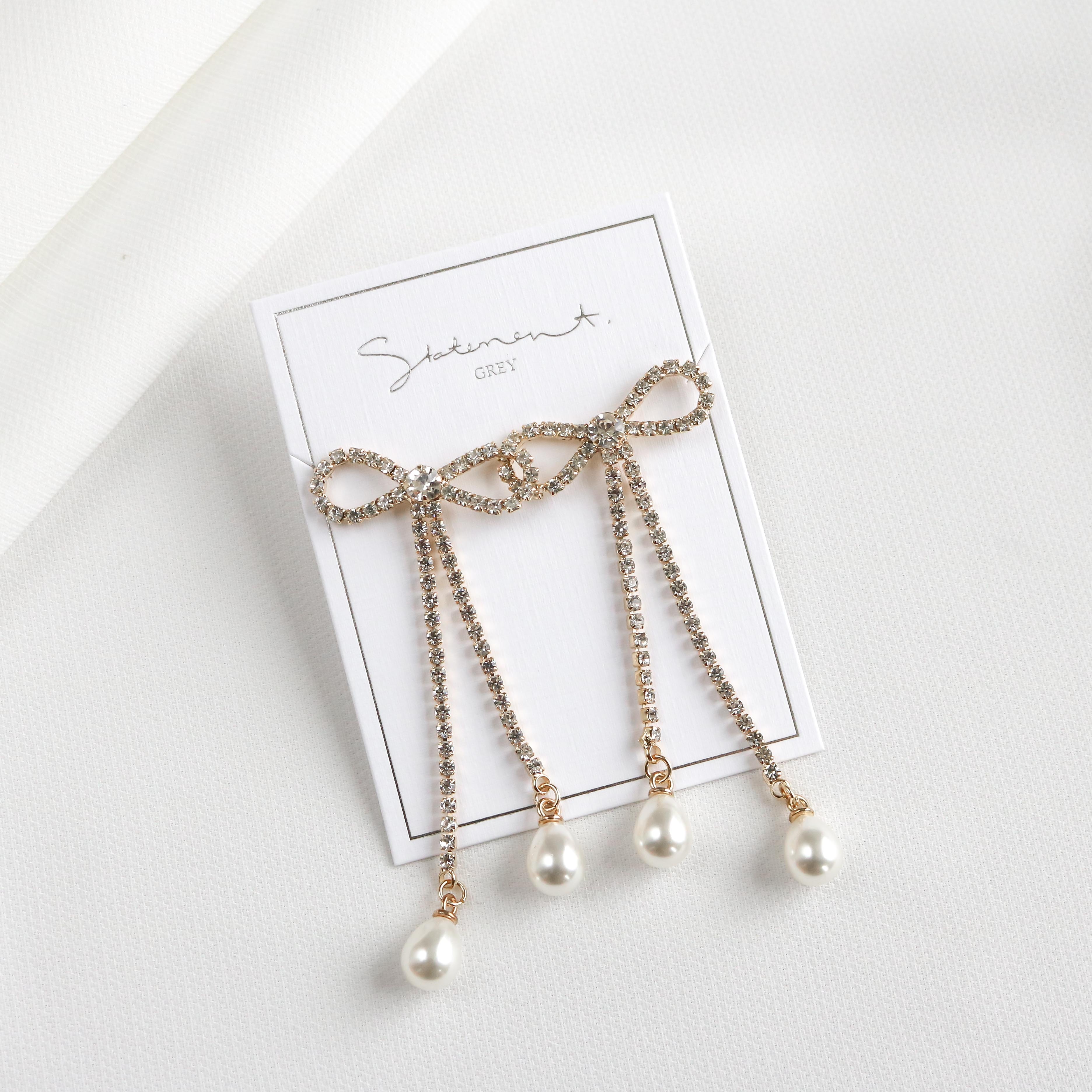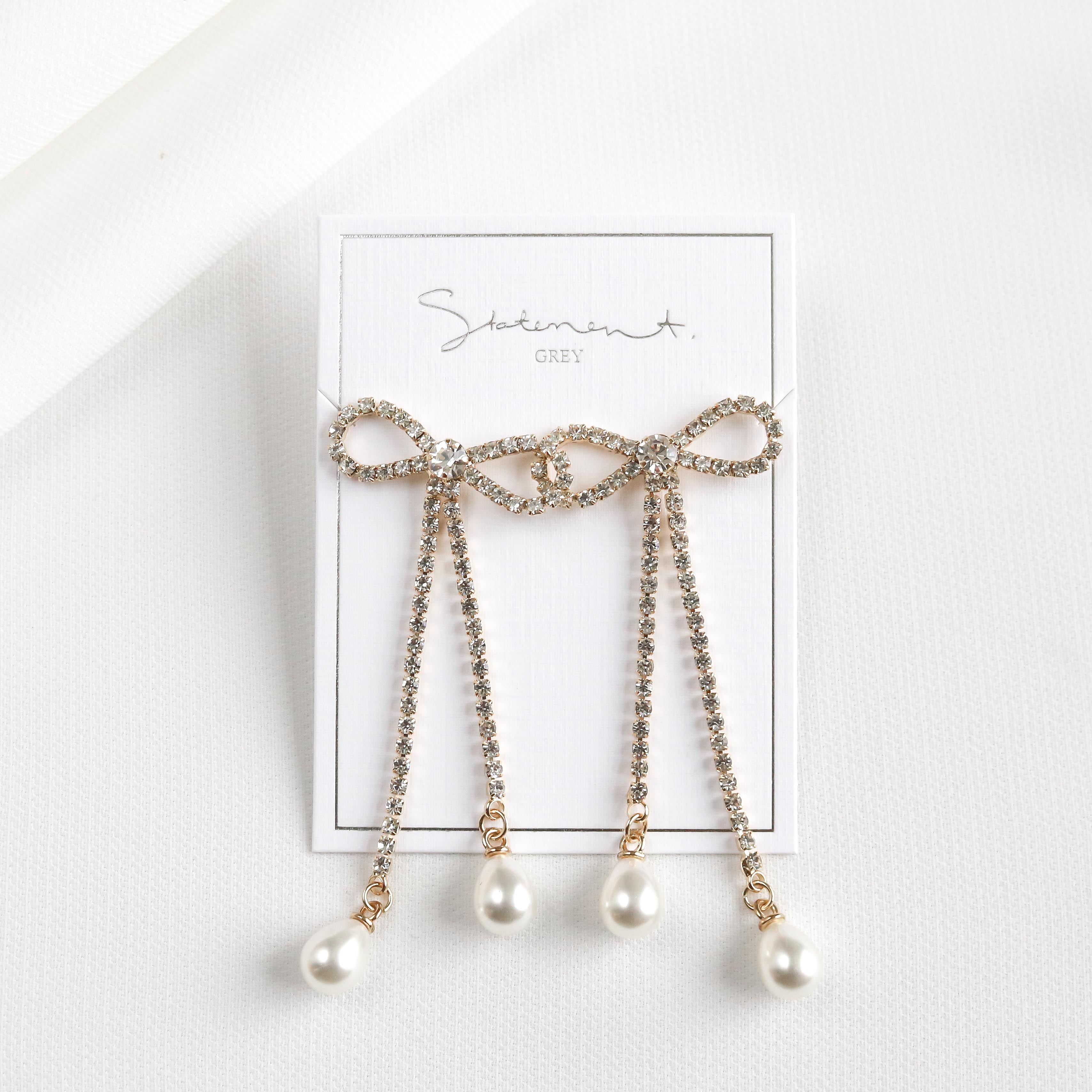 Elegant and feminine, the Halie Bow earrings uses a crustal encrusted bow design with elongated ribbons and finished with hanging pearls.
