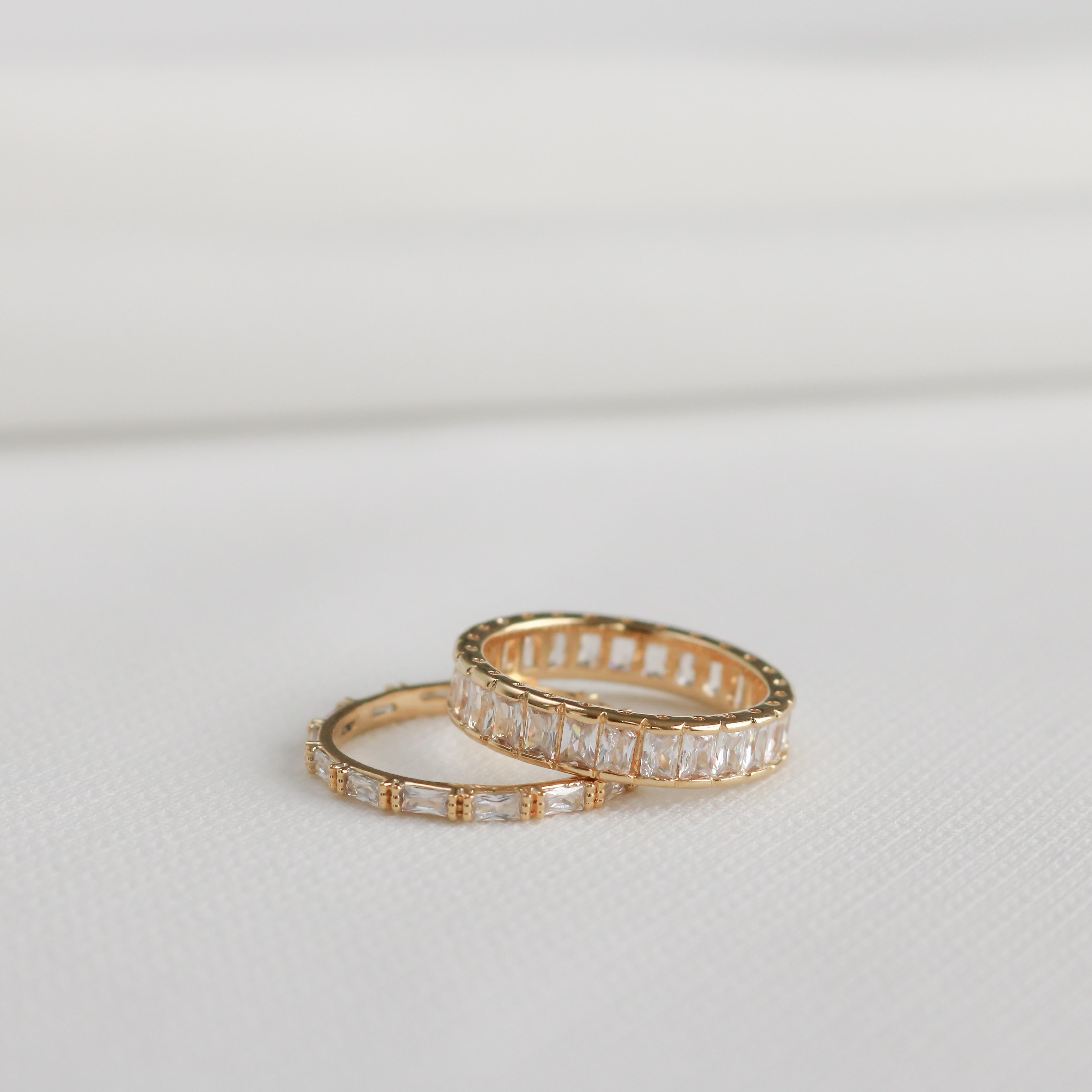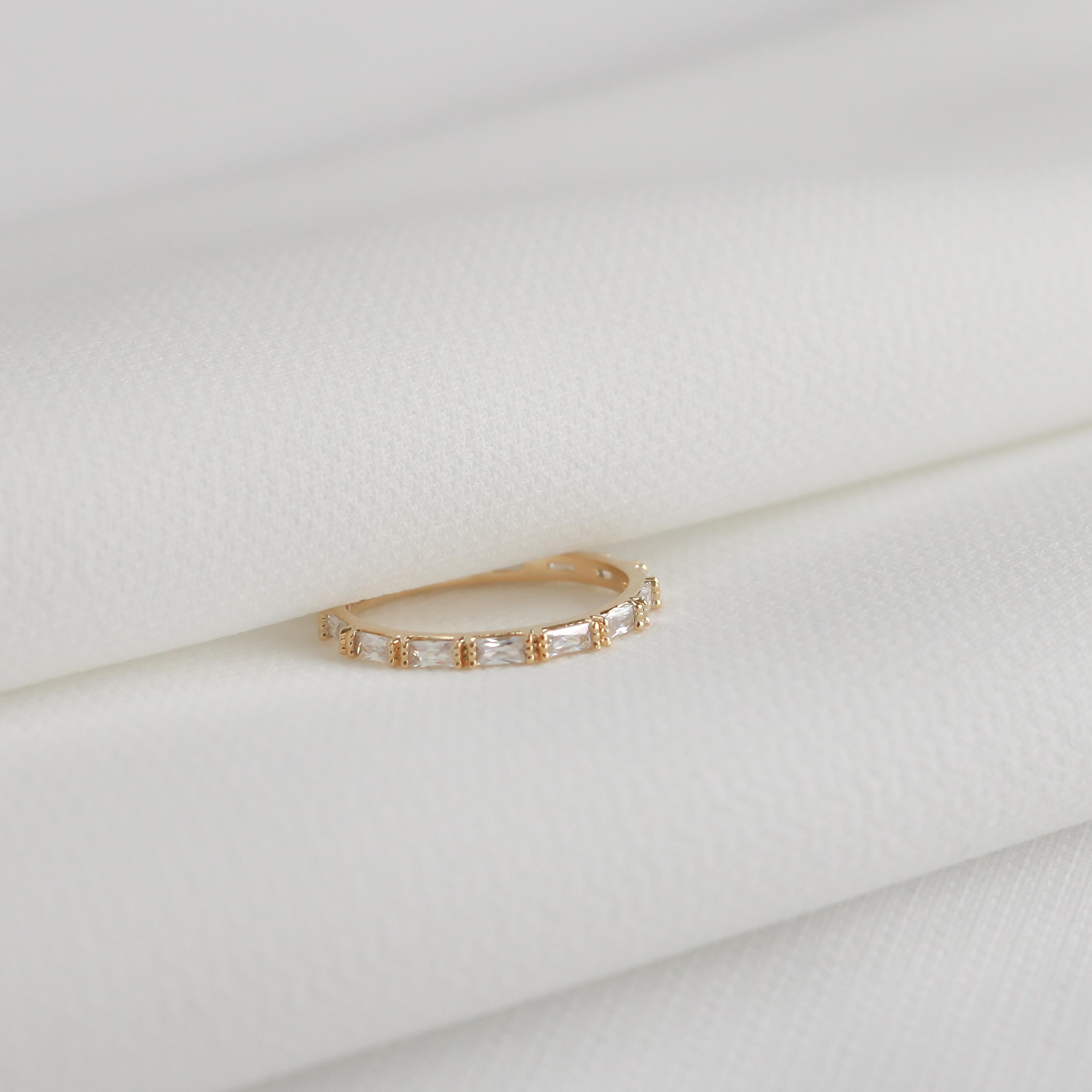 Incased with a milgrain beaded setting, slim baguette crystals surround the entire band. This eternity ring will have you staring all day long.